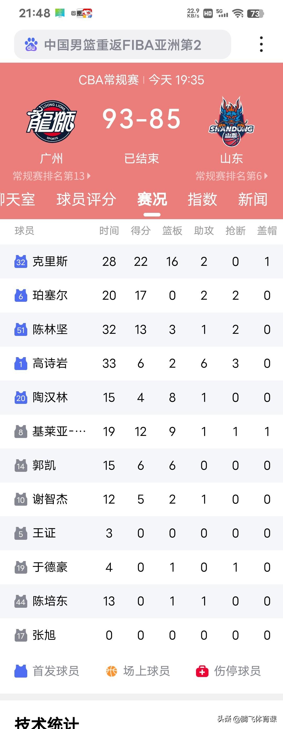 山东客场85:93爆冷不敌广州,这5人是山东队输球最大卧底: 1.高诗岩--作为球队队长,山东队唯一一名正牌国手球员,本场比赛出战33分钟,全场仅7投3中,仅得到6分2篮板6次助攻3次抢断,三分球3投0中,体现不出国手的真正实力,世预赛国家队的两场比赛,高诗岩三分球命中率100%.2投2中。 2.陈培东--作为山东队后场三分球命中率最高的球员,本场比赛出战13分钟,3投0中,一分未得,仅抢1篮板1次助攻。 3.陶汉林--作为山东队内线主力,面对身高更高的徐昕直接被打原形,全场出战15分钟,全场竟然仅9投2中,进攻贡献4分8篮板1次助攻,被对位的徐昕完爆。 4.珀塞尔--作为山东队第一得分手,比赛前三节竟然一分未得,全场贡献20分全部是第四节获得,全场仅13投5中,其中三分球7投2中,显然状态不在线。 5.邱彪(主教练)赛前山东队排在积分榜第6位,而广州队排在积分榜第13位,山东队的人员配置以及阵容实力肯定在广州队之上,显然!赛前主教练邱彪没有做好硬战的准备,加上广州队不按套路出牌直接打乱了山东队战术体系,山东队客场爆冷不敌广州,主教练邱彪承担一半以上的责任。