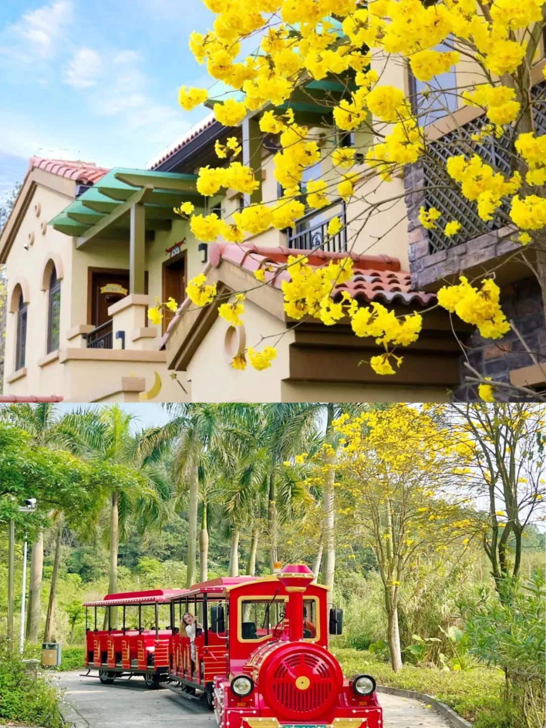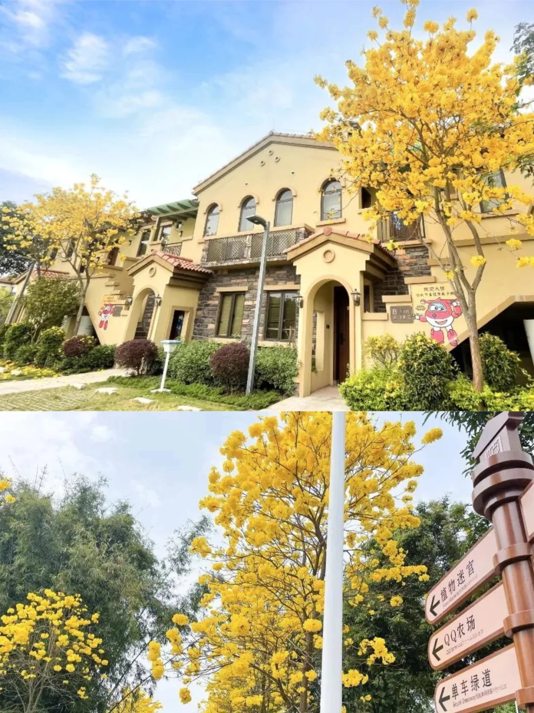 车刚开进度假区,就被两排高大的黄花风铃木接住了。一整条路都是晃眼的、饱和的金黄色。花朵簇成团团,压满了枝头,像一场只属于春天的梦。