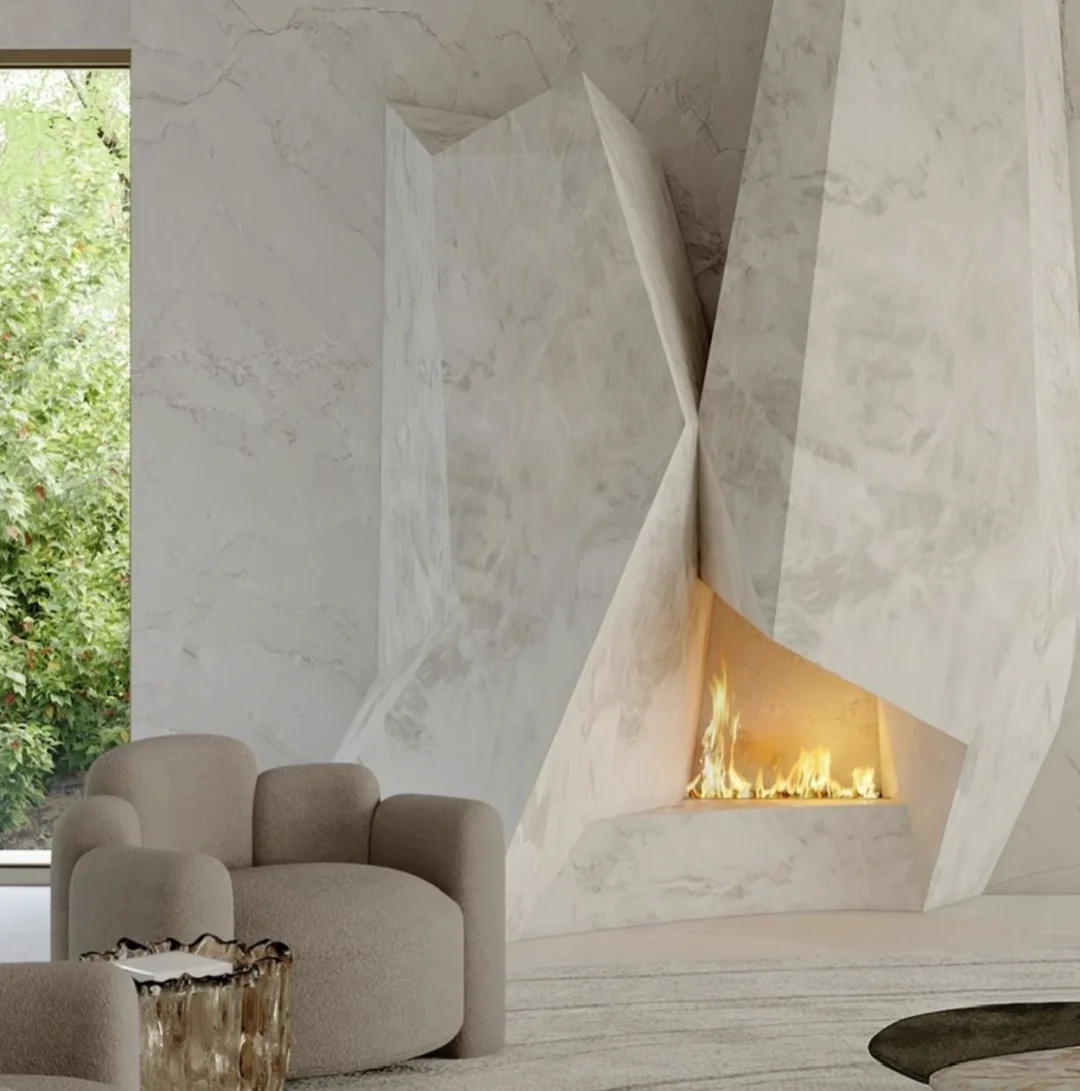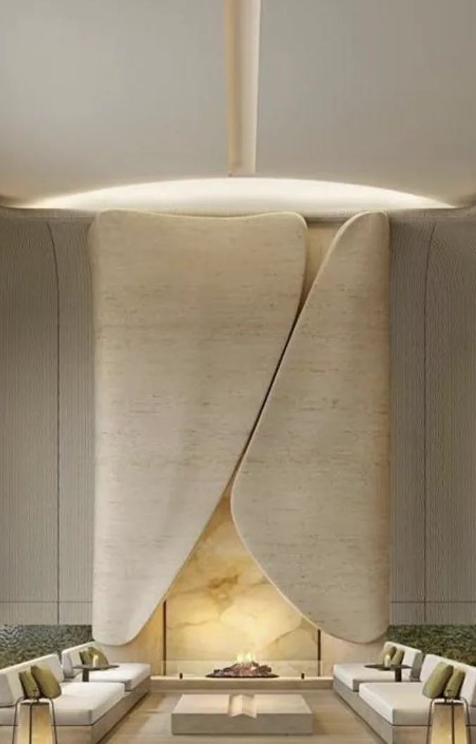 5. 折叠石幔壁炉:洞石被塑成柔软的“布幔”,包裹着火光,刚与柔的极致反差,仿佛在空间里上演一场雕塑剧。