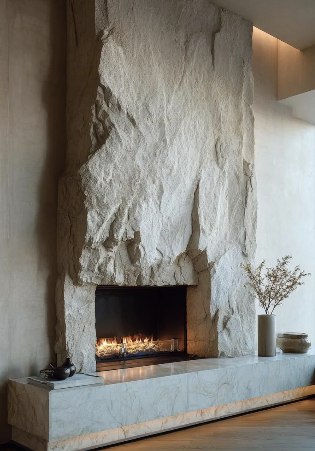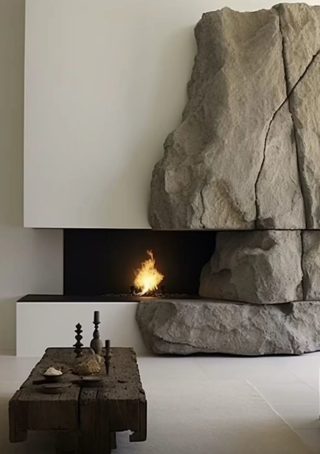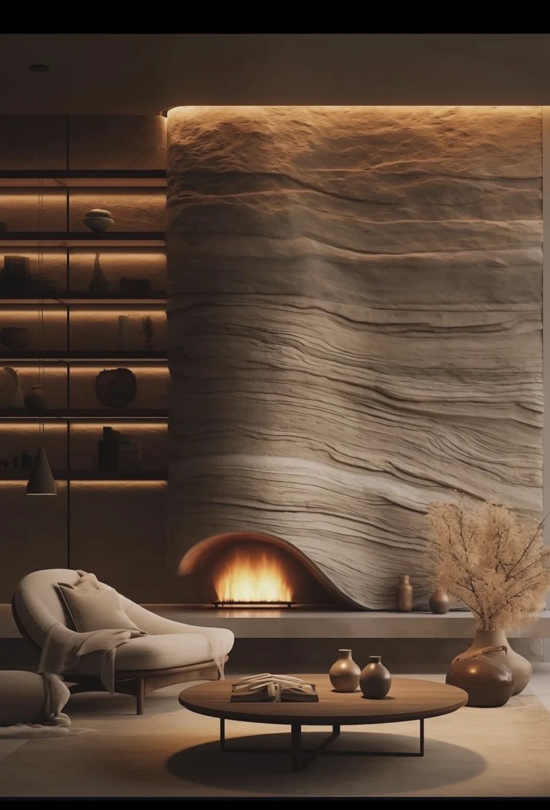 4. 流动岩层壁炉:整面墙如被风雕刻的沙丘,火焰从弧形洞口涌出,暖光顺着纹理流淌,侘寂风的松弛感直接拉满。