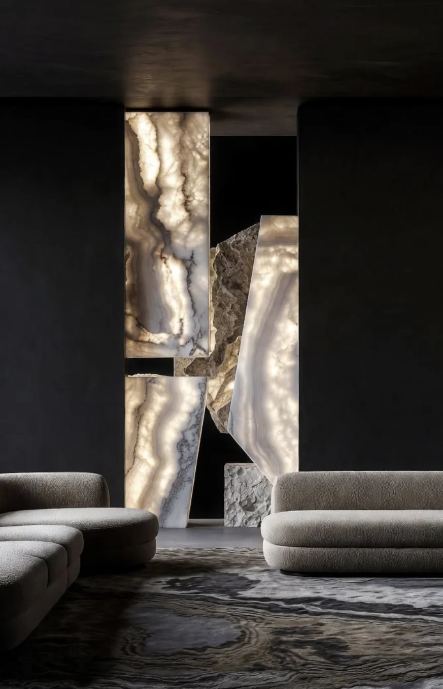 3. 透光大理石装置:天然石纹被背光点亮,像凝固的光瀑,粗犷原石与柔滑石材对话,每一道纹理都在诉说自然的力量。