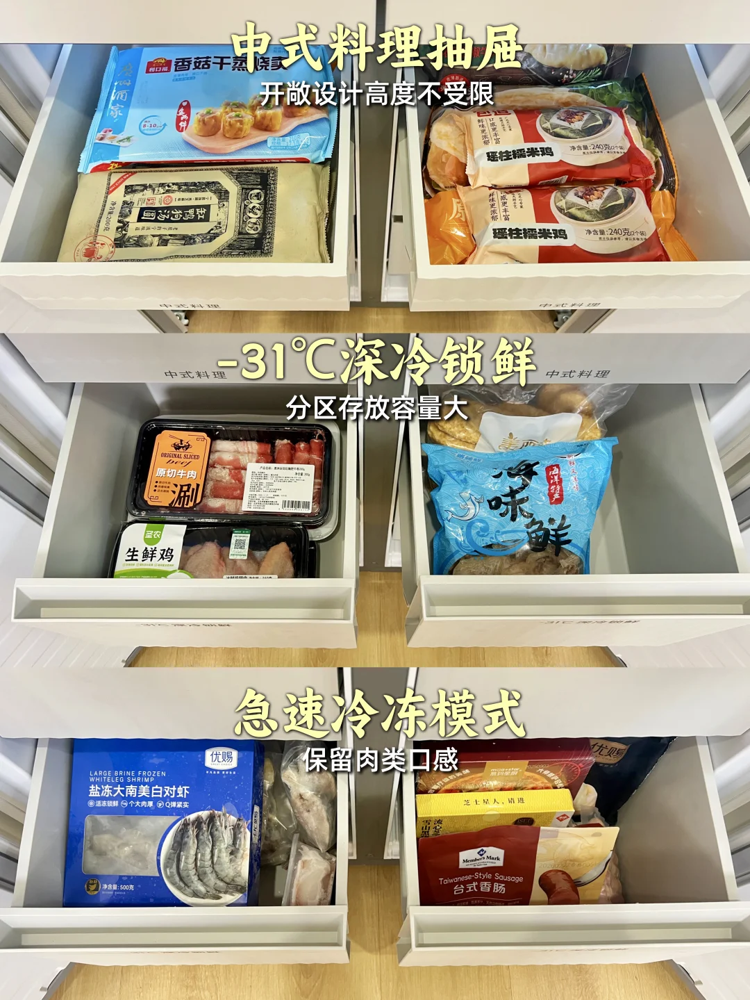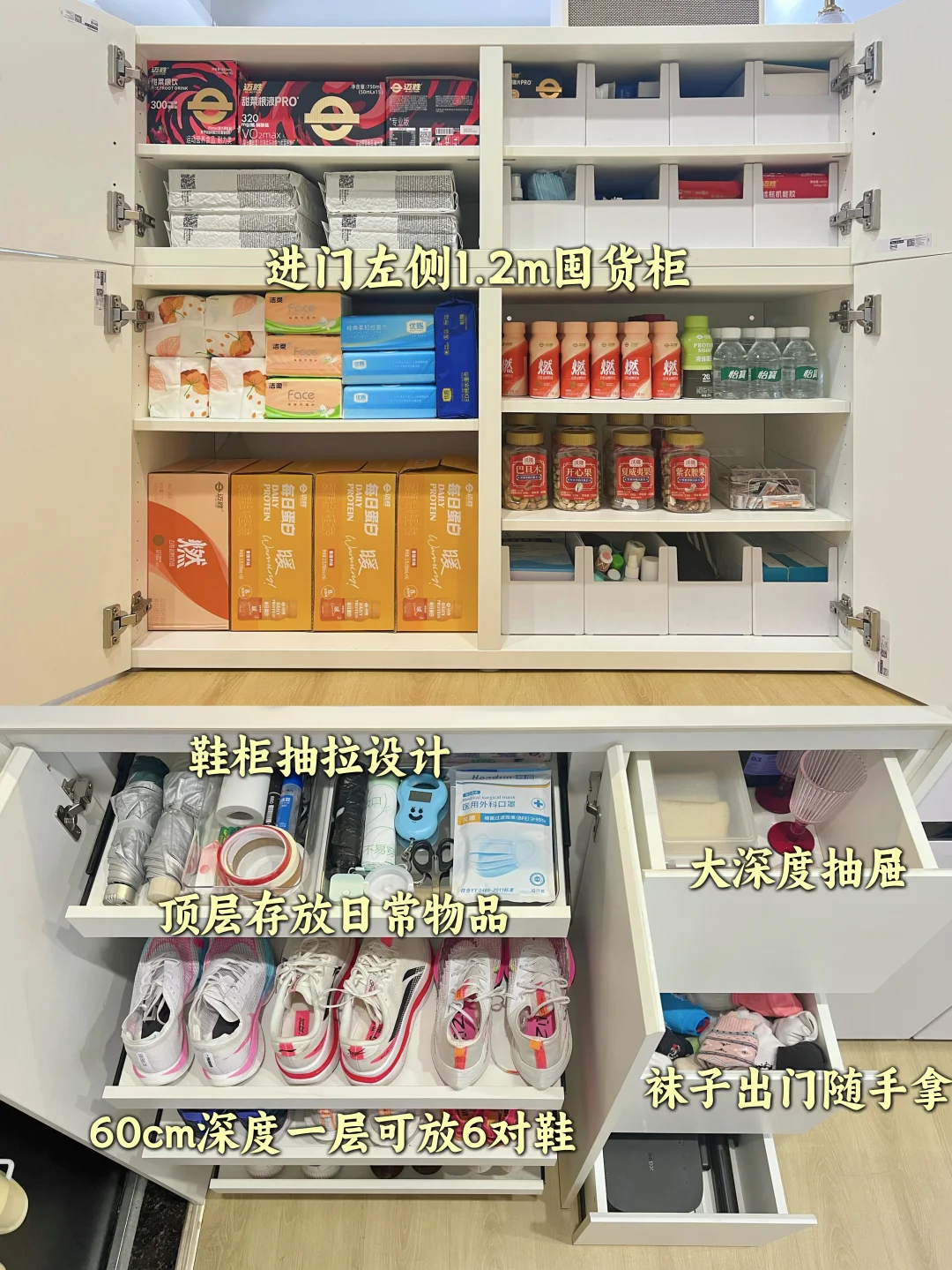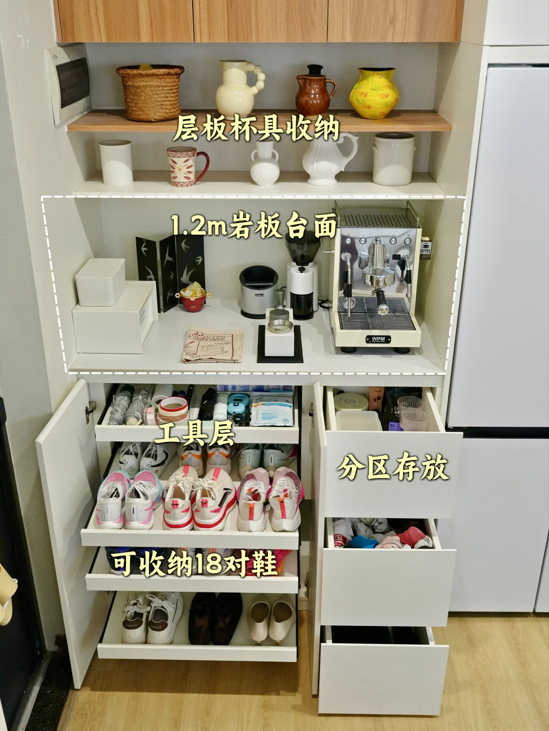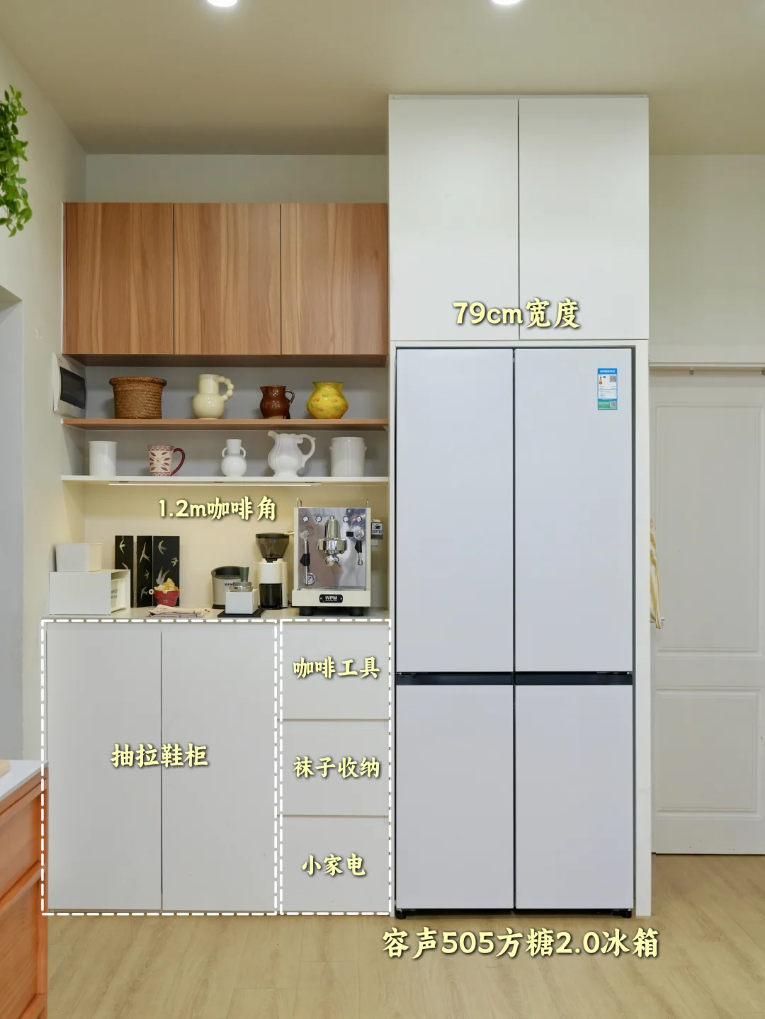我家是无玄关小户型,站在门口一览无余,为了拯救开门见山户型,我硬是造出了一个集玄关收纳+餐边柜+嵌入式冰箱于一体的多功能组合柜✨ 现在进门有隐私,还能收纳鞋子+生活杂物,最关键的是——容声方糖冰箱完美嵌入餐边柜👏 【餐边柜设计】 👉左侧: 餐边柜柜体深度统一做了60cm,和标准橱柜一致。 鞋柜设计抽拉层板,一层放6双鞋,拉出来一目了然,拿取超级方便👍 餐边柜台面作为咖啡角,而且紧邻着冰箱—— 这就引出了我家的“黄金动线”: 买菜回家→台面整理分拣→直接放进旁边的冰箱🔄 一步都不用多走,台面就是中转站,效率拉满!💪 👉右侧冰箱区❄️ 嵌入容声505方糖2.0冰箱,作为行业首个推出79cm黄金宽度的品牌,适配70%以上精装房冰箱标准预留橱柜为标准,60cm超薄机身,无需动橱柜即可完美平嵌✨ 我家选了星陨白面板,温润的流光质感,嵌在墙里仿佛和柜体融为一体💫 内里有505L的大容量,双系统设计,冷藏、冷冻独立运行互不干扰,物理上隔绝了串味✅。IDP主动双净2.0技术,智能识别用户使用习惯,会主动释放高浓度负离子除菌净味,净味率99.9%,主动除菌率99.9999%💯。 我家人口多,囤货是常态,以前蔬菜放两天就蔫😭肉解冻后全是血水! 容声方糖双养鲜能力不在话下,冷藏区有蓝光SPA养鲜,模拟自然光让蔬菜水果持续“光合作用”,放一周依然水灵。现在冰箱里水果,果汁、蛋糕甜点,一周食材放得下,还能一直保持新鲜! 冷冻区-31°C深冷速冻❄️,妈妈寄过来的海鲜解冻后新鲜如初,对我这种爱吃鱼虾的真的太友好了! 分区收纳的设计也很贴心,3大功能性抽屉,加上支持冰鲜、零度、母婴三种模式的变温空间,珍品抽屉存放花胶红参等食材存放不怕返潮,果蔬抽屉锁水控温,放一周都很新鲜👍冷冻区六个抽屉分区收纳,一目了然拿取方便 【入户右侧:1.2m柜子】📦 高度1m,作为我家的囤货区真的非常实用,柜子顶部还能作为分拣的台面,进出门动线流畅,效率拉满🎯 如果你家也是无玄关小户型,不妨用组合柜造出玄关,再把容声方糖2.0冰箱“藏”进去,你会发现,小户型也可以很能装,而且越住越顺手!💕