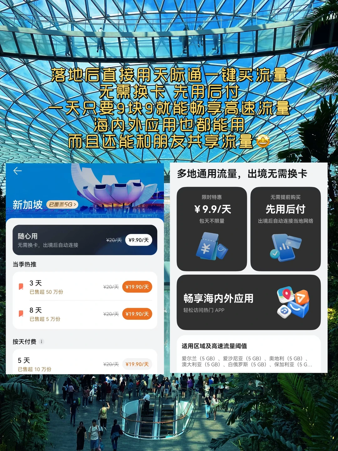 起飞前我先打开天际通开通了一个随心用套餐,每天只需要9块9还能先用后付,刚落地樟宜机场就立马帮我连上了当地的网络,不用再像之前那样到处找wifi和换卡,非常方便快捷。全程信号都非常给力,而且海内外应用都能用,坐地铁的时候我就丝滑刷着ins打发时间。更加给力的是它还支持流量共享,我和朋友俩人直接买一个一天9块9的套餐,人均才不到5块钱💰
