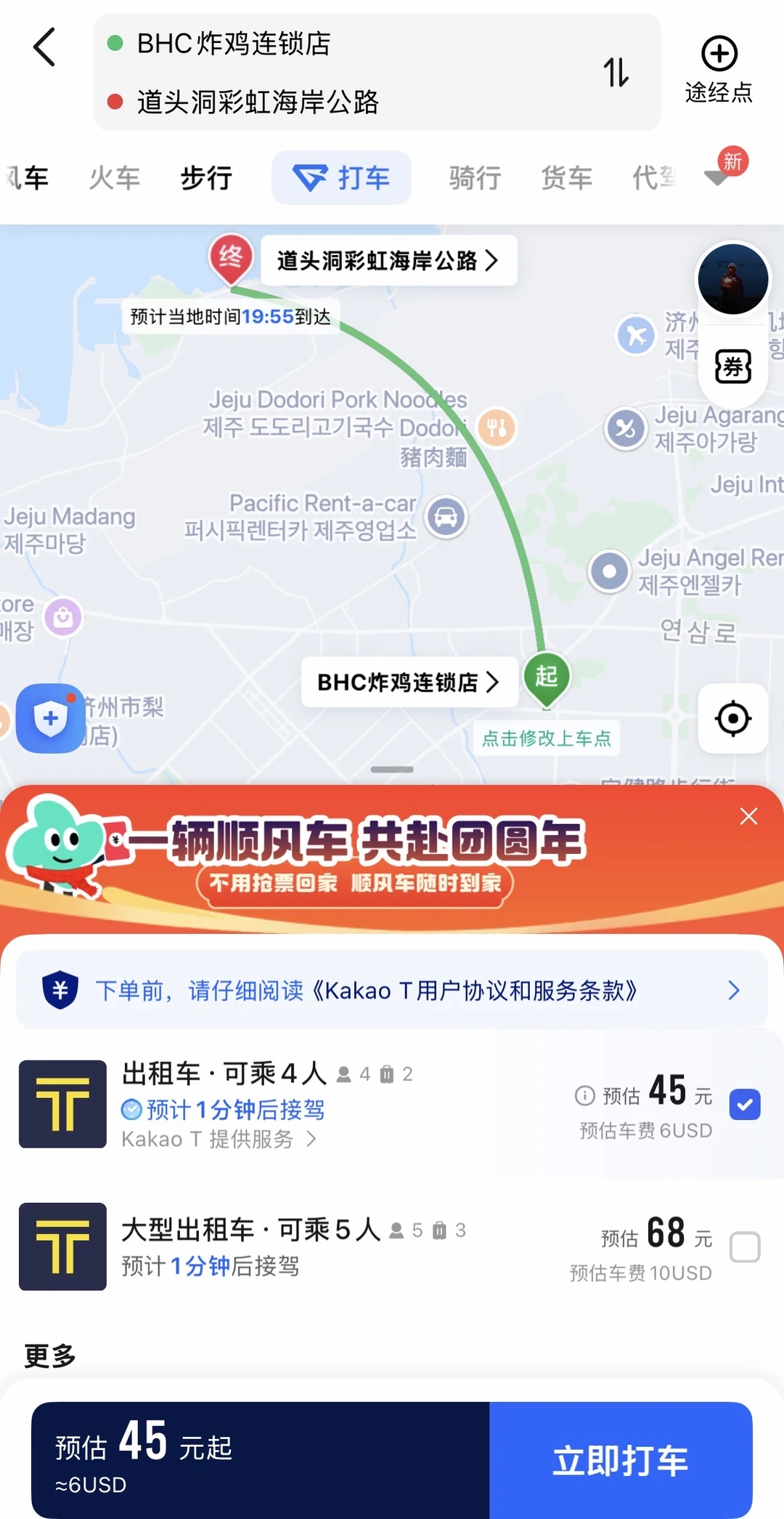 在济州岛用高德地图真的很方便!操作就像在国内打车一样简单,地址只需输入中文名就行,因为我们行李比较多直接选了较大的舒适车型,选完就可以打车啦~这时候可以看到,司机信息、预估价格都一目了然,车费保镖会监控路线之外,还会监控价格变化,溢价?不存在的!下车后直接电子支付,而且还是按汇率换成人民币结算的,我对比了一下,居然比本地打车APP还便宜💰