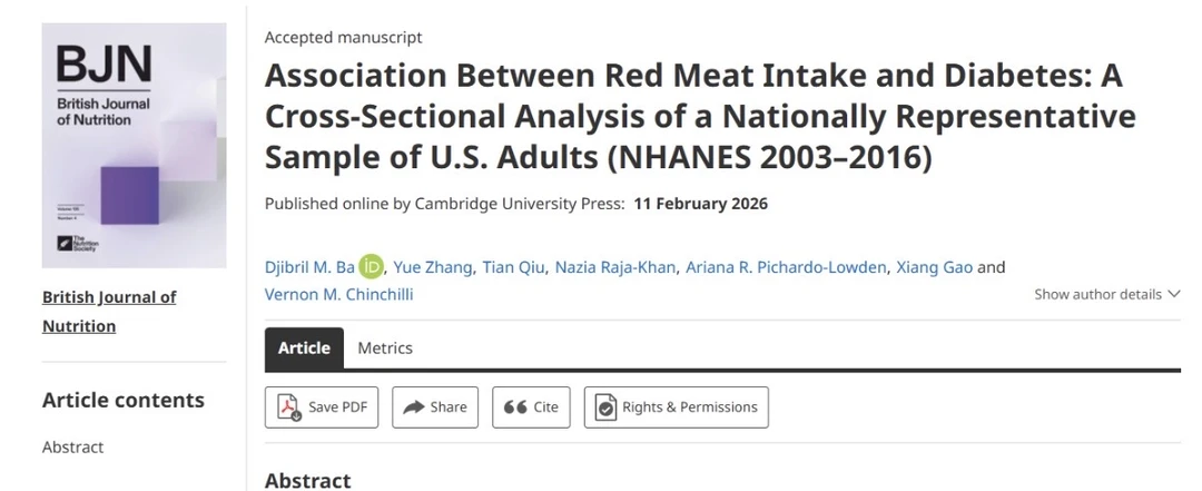 2026.2.11,复旦大学营养研究院(筹)、公共卫生学院与美国宾夕法尼亚州立大学医学院合作,在British Journal of Nutrition上发表了题为 “Association Between Red Meat Intake and Diabetes: A Cross-Sectional Analysis of a Nationally Representative Sample of U.S. Adults (NHANES 2003–2016)” 的研究论文。该研究旨在探讨美国成年人中红肉摄入量(包括总红肉、加工红肉和未加工红肉)与糖尿病之间的关联,并评估用植物源蛋白质替代红肉对糖尿病预防的潜在效果。