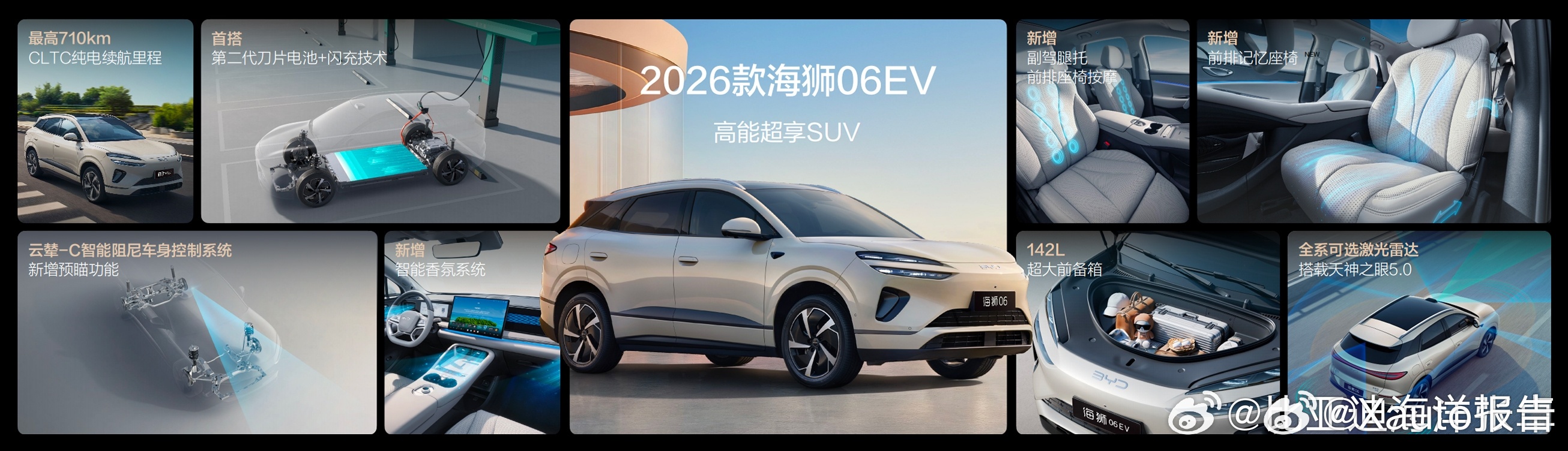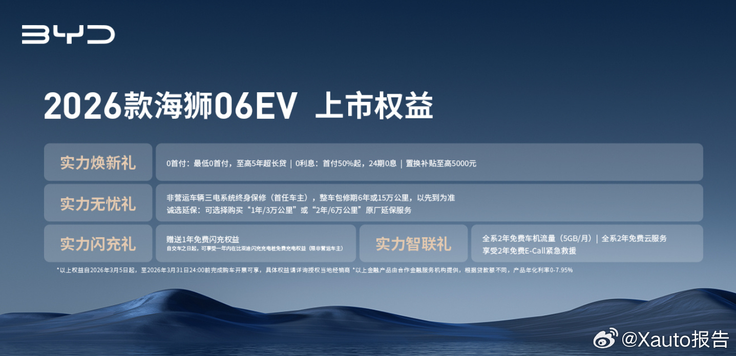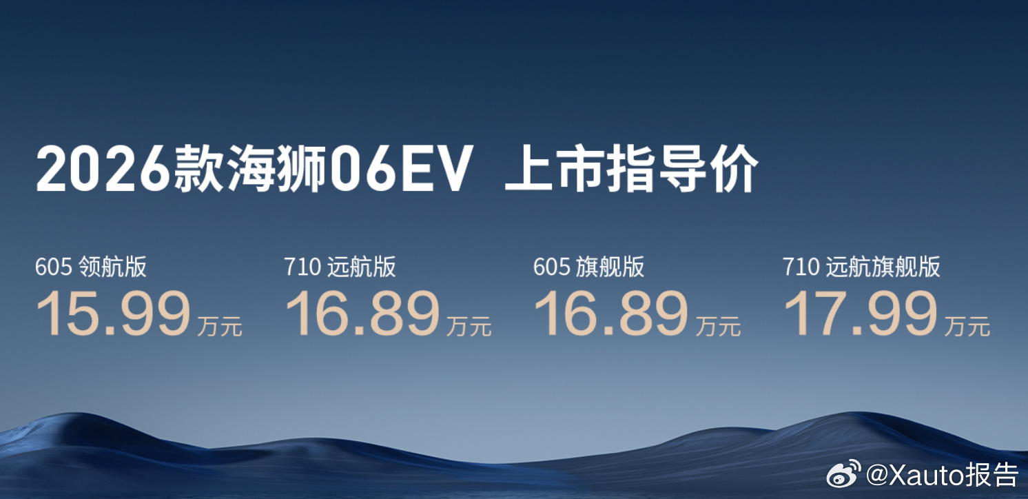 3月5日,比亚迪2026款海狮06EV正式上市,新车定位中型纯电SUV,共推出4款配置,官方售价15.99-17.99万元。基于e平台4.0,CLTC续航最高710km,支持900V高压闪充,30%-80%电量12分钟补能300+公里。