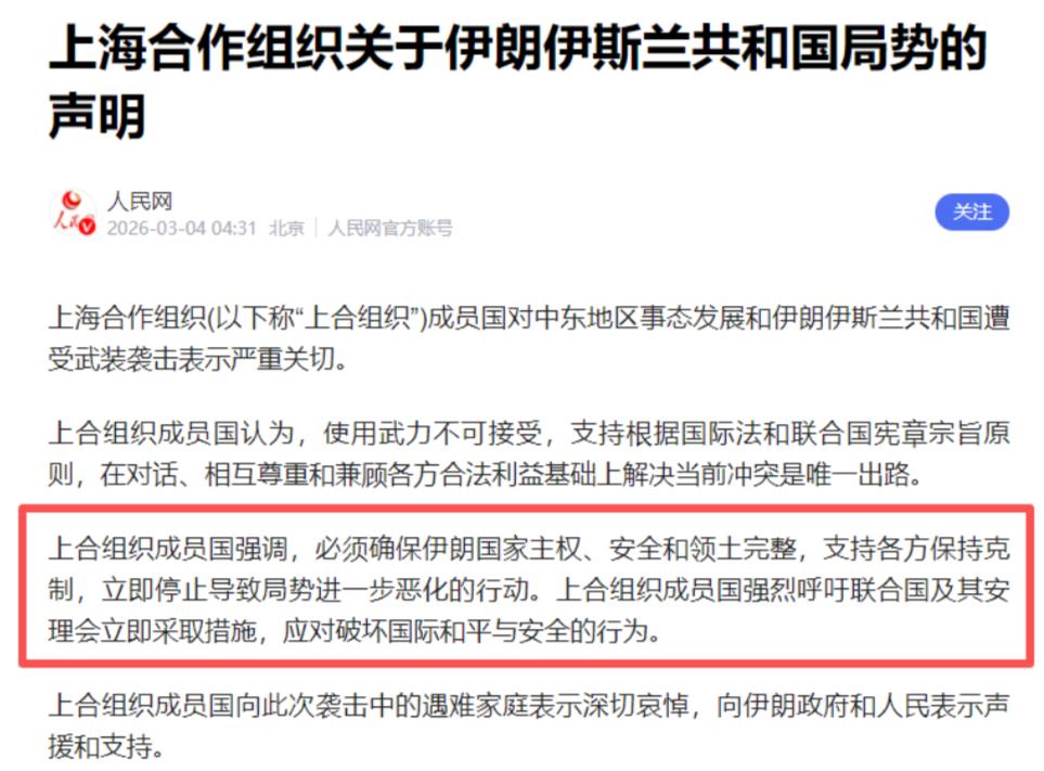 上合组织终于发声了!估计是内部协调了半天才达成一致,表达对伊朗成员国的支持。 战争开始了好几天,上合的声明终于在3月3日正式对外发布,没有多余的客套话,字字都戳中关键——反对使用武力,坚定维护伊朗的主权和领土完整,呼吁联合国赶紧出手遏制局势恶化,同时向伊朗遇难民众家属表示哀悼,给伊朗政府和人民实实在在的撑腰打气。 很多人可能不懂,上合组织为啥不一开始就发声,非要等这么多天?其实大家不用急着质疑,上合组织的发声从来都不是随便说说,每一句表态都要经过成员国之间的充分协调。 上合组织有10个成员国,每个国家的国情不同,对外立场也存在细微差异。此次围绕伊朗局势,各成员国需要充分沟通各自的考量,兼顾各方的合理诉求,才能形成统一的集体立场。 这种协调过程本身就需要时间,不是某一个国家说了算,也不是随便拍板就能发布声明。大家之所以觉得协调时间长,恰恰能看出这份声明的分量,它代表的是上合所有成员国的共同意志,而非单一国家的态度。 可能有人会问,上合组织这时候发声,真的能起到作用吗?答案是肯定的。上合组织是当今世界幅员最广、人口最多的综合性区域合作组织,成员国合计人口约占全球44%,经济体量和国际影响力都不容小觑。 这份声明最关键的一点,是明确表态维护伊朗的主权和领土完整。伊朗是上合组织的正式成员国,上合组织对伊朗的支持,既是履行组织义务,也是维护自身组织的原则和底线。 此次美以联合对伊朗发动军事打击,是在伊美谈判取得积极进展的背景下突然打响的,这种行为违反了国际法准则,也踩踏了伊朗的红线。上合组织反对使用武力的表态,直接戳中了此次冲突的核心矛盾。 国际社会很多国家都在观望,要么不敢表态,要么被西方裹挟,而上合组织的发声,给国际社会树立了一个明确的标杆。它向全球传递出清晰信号,反对单边军事行动,主张通过外交途径解决分歧。 声明中呼吁联合国赶紧出手,也有着深层考量。联合国作为全球最大的国际组织,肩负着维护国际和平与安全的职责,上合组织的呼吁,既是推动联合国履行职责,也是联合国际社会的力量,共同遏制局势进一步恶化。 很多人忽略了一个细节,3月2日伊朗外长阿拉格齐曾致电中国外长王毅,通报战况并寻求支持。王毅外长在通话中明确表态,支持伊方捍卫主权安全和领土完整,还密集致电俄罗斯、法国、阿曼等国外长,协调各方立场。 紧接着,3月3日上合组织就发布了这份声明,这个时间差耐人寻味。这背后离不开中国的积极协调,也体现了上合组织应对地区危机的高效协作能力。 上合组织此次发声,也打破了一些西方媒体的谣言。此前有西方媒体炒作“伊斯兰世界倒向美以”,但上合组织中的巴基斯坦作为伊斯兰世界唯一的核国家,公开站出来支持伊朗,直接粉碎了这一谎言。 伊朗当前正面临着多重困境,军事打击、经济制裁、民生压力叠加,上合组织的声援,不仅是外交上的支持,更能给伊朗政府和人民注入信心。它让伊朗知道,自己不是孤立无援的,有上合这个强大的多边平台作为后盾。 还要明确一点,上合组织的支持不是挑事,也不是要卷入冲突,而是坚守公道正义。上合组织一贯坚持不结盟、不对抗、不针对第三方的原则,此次发声只是为了维护国际公平正义,推动局势回到谈判桌前。 国际原子能机构3月2日公开表示,未发现伊朗有系统性核武器制造计划,这直接击穿了美以“伊朗核威胁迫在眉睫”的开战借口。上合组织的声明,也是对这种霸权主义借口的有力驳斥。 现在的局势依然复杂,战火还在继续,国际油价持续高位,全球能源安全面临挑战。上合组织的发声,只是一个开始,后续还会通过自身的多边机制,继续推动局势降温,呼吁各方保持克制。 上合组织这迟来的声明,不是犹豫,不是妥协,而是经过深思熟虑和充分协调后的坚定表态。它既给了伊朗实实在在的支持,也向全球展现了多边组织的力量,更传递出反对霸权、坚守和平的坚定立场。