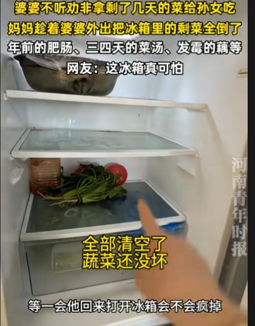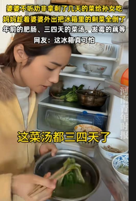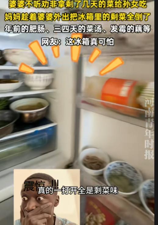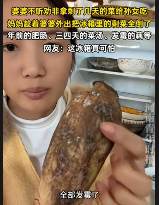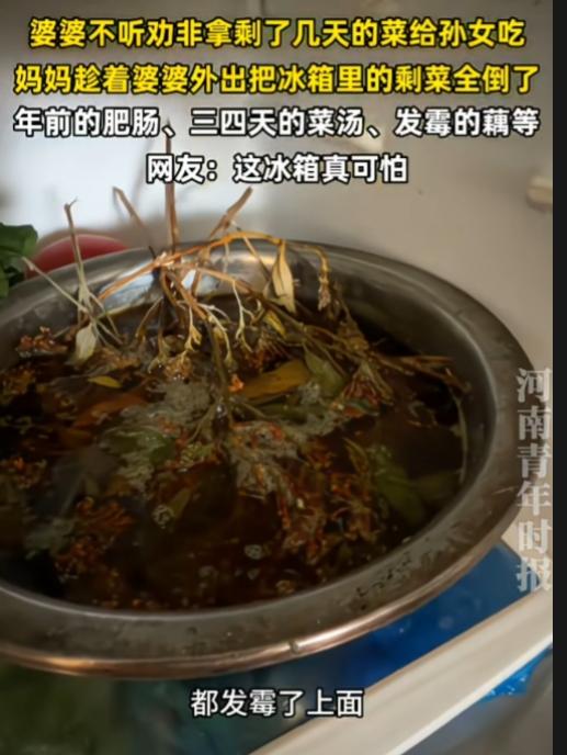 这样的婆婆一言难尽啊!极品啊! 几千的羽绒服舍得买,发霉的菜却不舍得扔。自己吃剩菜也就算了,还要给孙女吃。 这冰箱打开,全都是剩菜味。年前的肥肠,三四天的菜汤,发霉的藕……女子趁着婆婆外出把冰箱里的剩菜全倒了。 剩菜也就算了,还什么都剩,还不盖保鲜膜,还有发霉的剩菜。发霉的食物里面有大量的黄曲霉素,一级致癌物啊,这冰箱太脏了,太可怕了。 这些装菜的碗盘、冰箱,都要好好清理下,高温消毒一下。 神奇的是,这么毒的剩菜,这婆婆吃进去也没啥问题啊,这身体素质太好了? 看着是节俭,其实是败家。万一真出事了,中毒了,去一趟医院花费更大! 建议女子下次别丢, 她要想节俭,怕浪费。就剩菜留起来,及时热给她吃,吃完为止。孩子还小,还是吃新鲜的好。