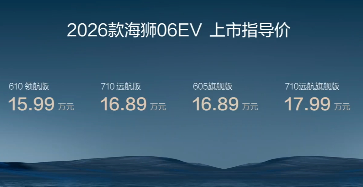 2026款海狮06&07符合你的预期吗?26款全系都带上刀片电池和闪充,还有云辇和预瞄,50w无线充电,天神之眼5.0,前备箱等都有了,属于在充电技术的小升级(其实是巨大升级),总体来说是符合预期的,这次更新之后,技术都上一个等级了。海狮06 EV是4个配置:15.99万 610领航版/16.89万 710远航版/ 16.89万 605旗舰版/ 17.99万 710 远航版海狮07 EV是2个配置:16.99万 705尊荣型/18.99万 705旗舰型以上都可以选配天神之眼B,但是教授觉得对比隔壁的宋Ultra,这个还是略贵的,下次发布会,价格会更好吧?