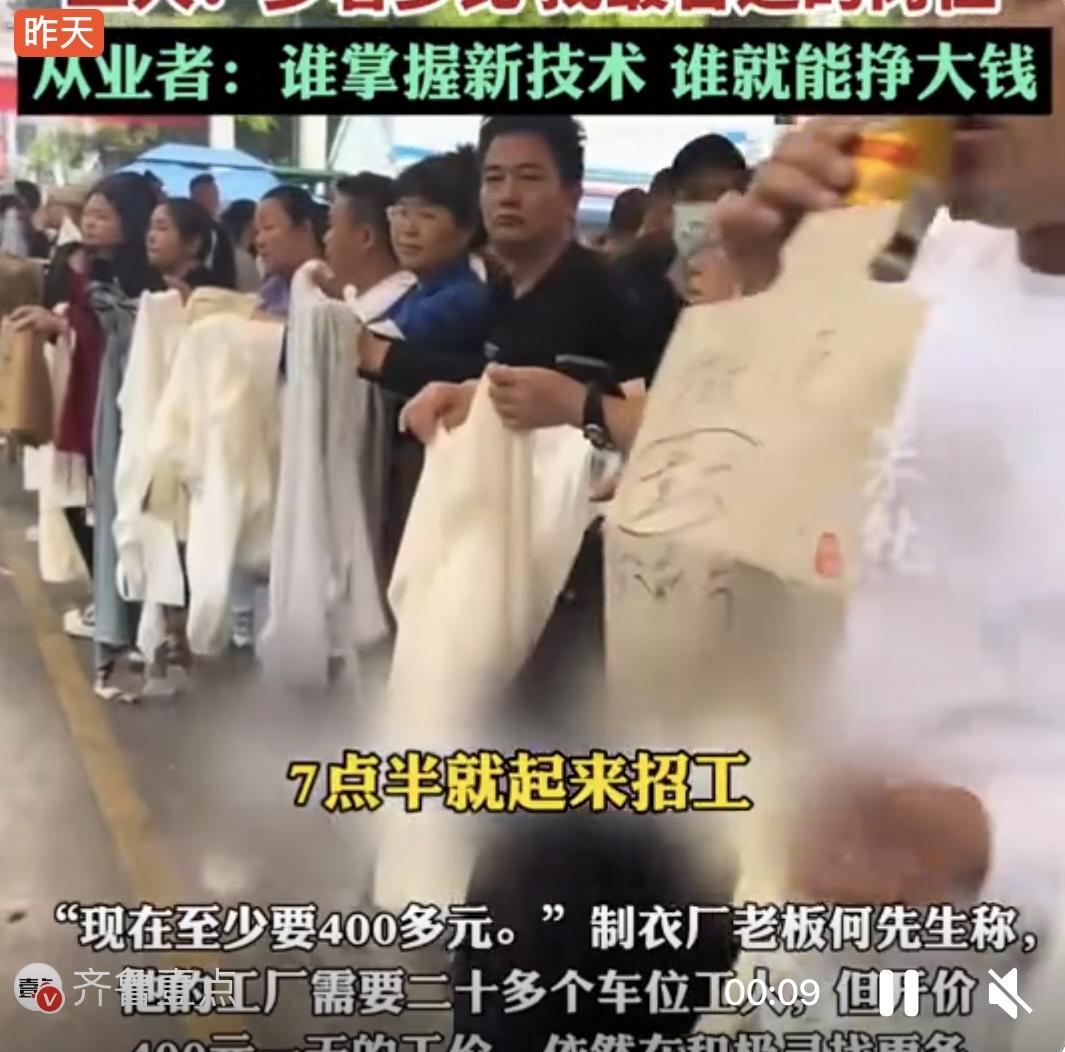 近日,广州市海珠区康乐、鹭江、大塘一带的制衣村再现招工潮。清晨五六点,数百名工厂老板就手持成衣样品,在街头排队抢人,开出了日薪400元起的价格,熟手工人日薪更是可达五六百元,还包两餐、日结现结,但即便如此,仍难招满员。