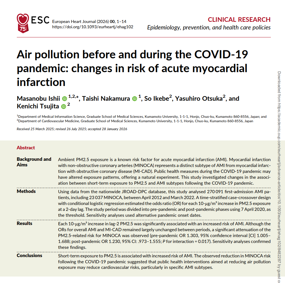 戴口罩还有这个好处好处的!¹ 疫情期间,日本的一种亚型心梗明显变少了!MINOCA,这种心梗跟空气污染尤其是PM2.5污染有强关联。² 空气污染严重时,心脏病发作风险会升高。但戴口罩减少了暴露,降低了血管功能障碍风险,于是减少了心梗发作。