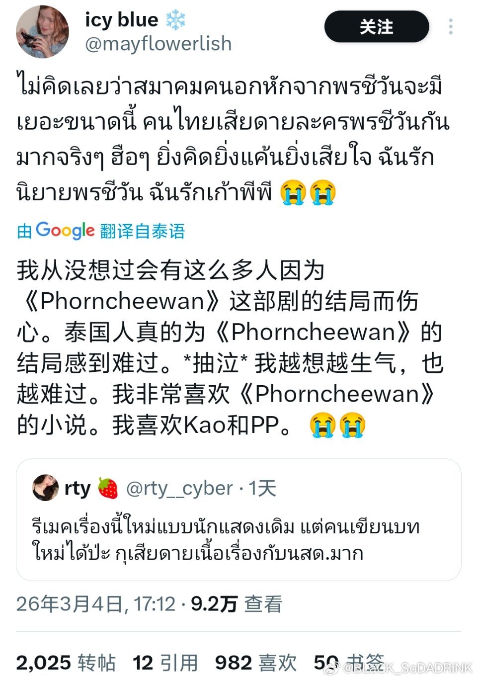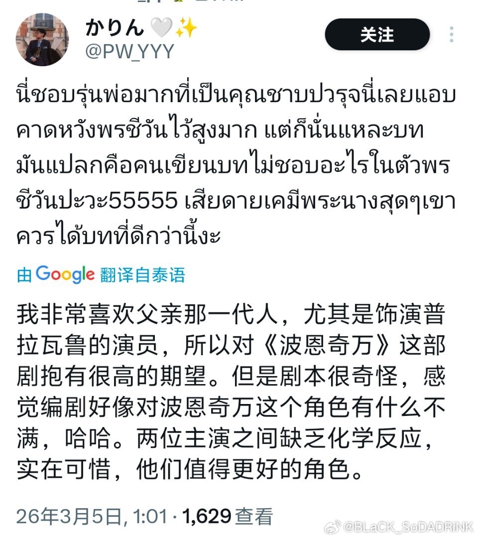 两天了!随便一截,推人从惋惜浪费选角到讨伐sb编剧,看到🇹🇭人也有这么严重的ptsd,我的ptsd好些了!想到那会儿有人说不理解这部的收视,是因为狗血才拿下系列第一的收视就想笑!看看🇹🇭人的反映吧!真谈不上吹,就是他俩“人带剧”了!随便换其他谁来演,🇹🇭人都不至于这么意难平,烂了就烂了!最后,想对🐶3️⃣说的都在最后两张图里了