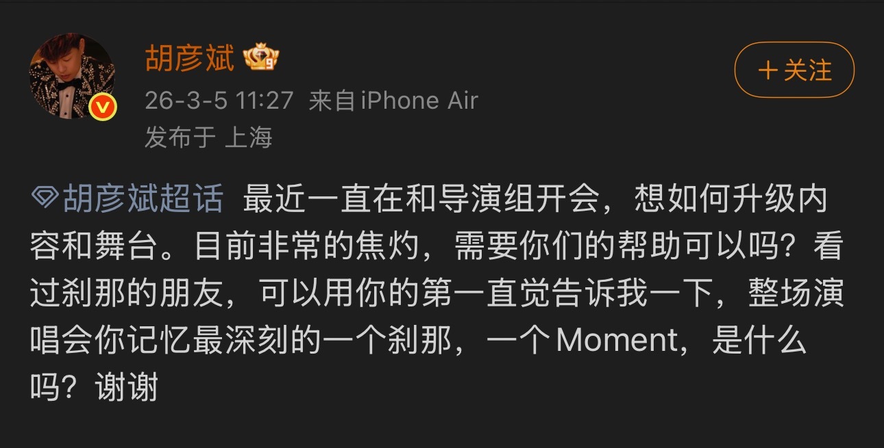 胡彦斌超话求助粉丝胡彦斌「是一场烟火・刹那」巡回演唱会苏州站和天津站的消息太让人