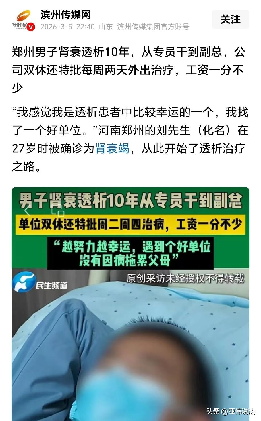 这老板大气!河南郑州,男子10年前被确诊为肾衰竭,本以为漫长的透析之路会让他失去工作,拖垮家庭。没想到,公司非但没有解雇男子,还极力支持男子,不仅保证双休,还,特批每周两天的治疗假,工资还一分不少。不仅如此,男子十年内还从从专员晋升为公司副总,事业路上可谓是节节高升。网友感概:这是什么神仙公司? 男子刘先生是不幸的,年纪轻轻就突发肾衰竭,但他又是幸运的,遇到了一个让人暖心、有人情味的好公司。 事情要从十年前说起,当时27岁的刘先生刚毕业没几年,正是努力打拼、为生活奋斗的年纪,却突然被确诊为肾衰竭。 这个消息对他来说无疑是晴天霹雳,一想到接下来要长期做透析治疗,他心里又慌又怕,满是绝望。 他最担心的就是自己的工作保不住,毕竟没有哪个公司愿意长期养着一个需要频繁请假治病的员工。 一旦丢了工作,不仅漫长的透析费用没了着落,还会拖垮整个家庭,拖累父母,想到这些,刘先生甚至做好了被公司辞退的准备。 可让刘先生万万没想到的是,公司得知他的病情后,不仅没有丝毫辞退他的意思,反而第一时间给他吃了定心丸。 公司特意为他开通了特殊照顾,明确保证让他正常享受双休,还特批他每周二、周四都可以安心外出做透析治疗。 最让人感动的是,治疗期间的工资一分钱都不会少发。 这份突如其来的温暖,让陷入低谷的刘先生瞬间红了眼眶,心里的不安和焦虑也消散了大半,他暗暗下定决心,一定要好好工作,绝不辜负公司的信任和善待。 从2013年毕业进入公司开始,刘先生就一直踏实努力,生病之后,他更是没有因为治疗耽误工作,反而比以前更加用心。 公司的包容和支持,成了他最大的底气,他一边规律的进行透析治疗,一边全力以赴投入到工作中,把所有的精力都放在岗位上,用努力回报公司的善意。 十年时间一晃而过,在公司的全力支持和自身的不懈奋斗下,刘先生的人生没有被病魔打倒,反而一路逆袭。 他从最开始的普通专员,一步一个脚印稳步晋升,凭借出色的工作能力和认真的态度,一步步做到了公司副总经理的位置,如今甚至还在攻读MBA,不断提升自己。 回想起这十年的经历,刘先生满是感慨,他直言自己是透析患者中最幸运的那一个,这辈子最幸运的事,就是遇到了这么好的单位。 这十年里,因为有公司的保障,他没有因为生病拖累过父母,也没有因为病情放弃自己的事业,反而活成了很多人羡慕的样子。 刘先生的故事传开后,大家纷纷感叹这是什么神仙公司,也由衷为刘先生感到开心。 不少人说,这样有人情味、懂得善待员工的企业,才是真正值得依靠的靠山。 而刘先生的努力和公司的善意,也成就了一段双向奔赴的暖心佳话。 这十年,是公司对员工的不离不弃,也是员工对公司的尽心回报,简单又真挚的温暖,让这份职场情谊显得格外珍贵。 《劳动合同法》第四十二条明确规定:劳动者患病或者非因工负伤,在规定的医疗期内的,用人单位不得随意解除劳动合同。 本案中,刘先生确诊肾衰竭需长期透析,处于法定医疗期内,公司未以患病、不能胜任等理由解除劳动关系,完全符合法律的解雇保护要求。 从法律角度而言,只要求医疗期内支付不低于当地最低工资80%的病假工资,而该公司不仅全额照发工资,还特批每周两天治疗假、保障双休,远超法定义务。 公司后续正常晋升、支持其攻读MBA,属于合法行使用工管理权与人文关怀结合,更能实现企业与员工双向稳定。