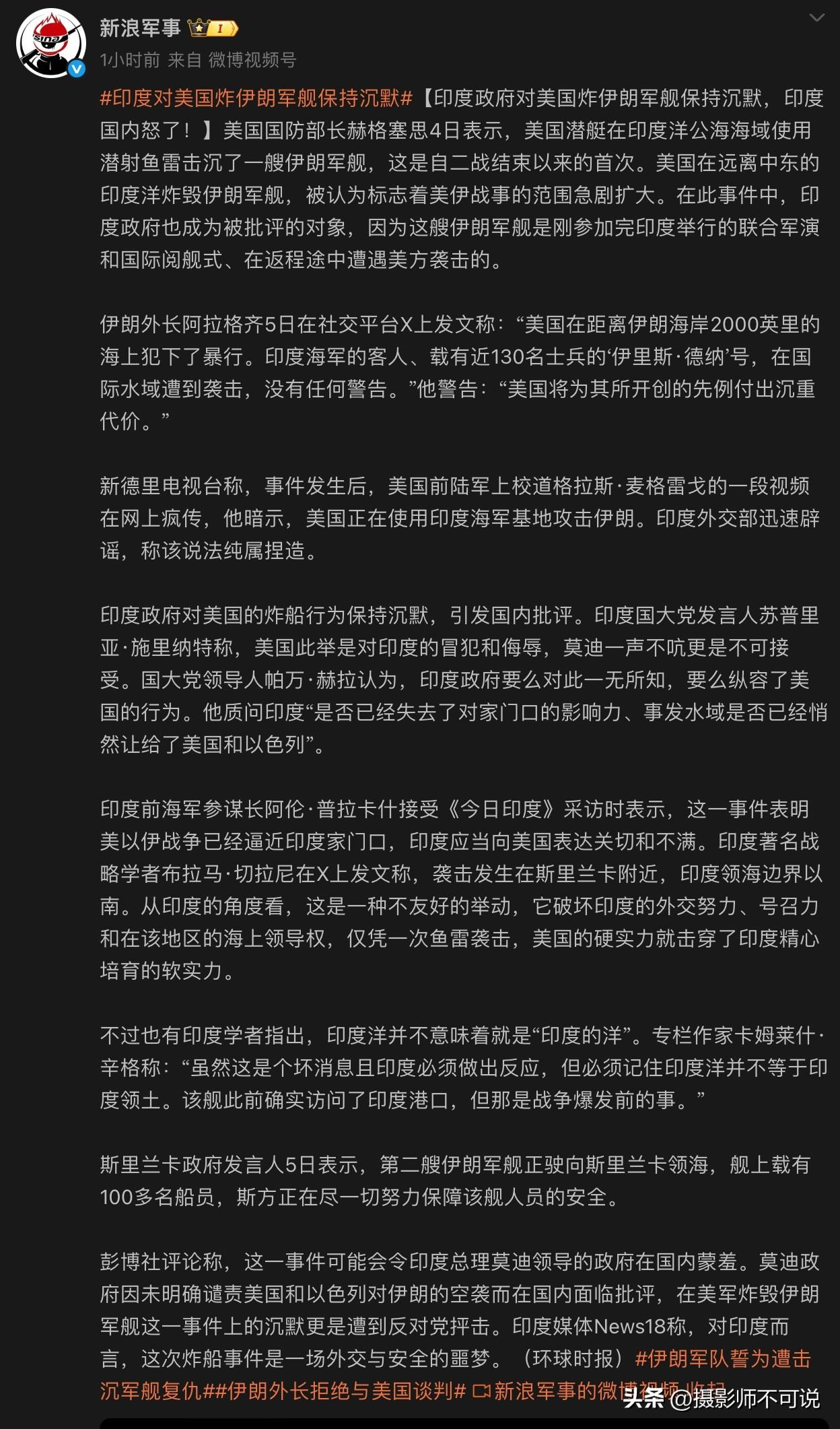 印度对伊朗军舰被美国偷袭击沉默不作声,印度国内民众怒了,我也怒了!要知道这次伊朗军舰可是应印度邀请参加联合军演和国际阅舰式后,在返回途中被美军潜艇偷袭的。这不但是不讲武德,更是一点都没有给印度面子。其实,我觉得这都还好,毕竟老美什么时候讲过武德?印度什么时候有过面子?但结合事件发生后美国前陆军上校道格拉斯.麦格雷戈的一段视频暗示,美国正利用海军基地攻击伊朗。虽然这段未经证实,但无风不起浪,印度在事后保持沉默连个谴责都没有。我个人完全有理由怀疑,这次事件有可能就是印度配合美国联手做局,然后泄露时间和行踪给美军。否则,在距离战争2000多英里的茫茫大海上,伊朗军舰怎么可能如此精准的被美军潜艇锁定?当然这只是我个人怀疑,不代表客观事实,如有雷同我概不负责!