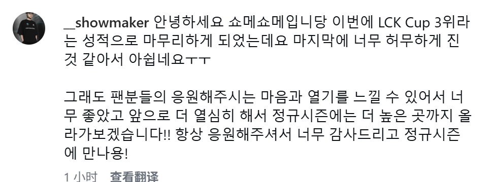 "大家好,我是ShowMaker呀。这次LCK杯以第三名的成绩结束了,最后好像输得太空虚了,很可惜。