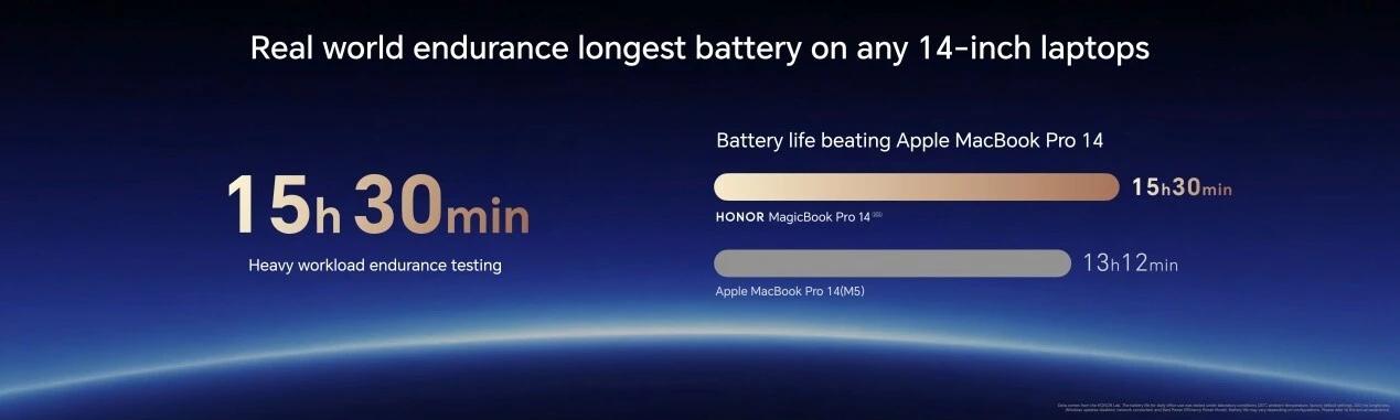 荣耀这次真把苹果的脸打肿了。MWC 2026上亮相的MagicBook Pro 2026,实测15.5小时续航,直接把M5芯片的MacBook Pro 14的续航王冠摘了,登顶14寸轻薄本续航第一。这底气是92Wh大电池和Turbo X技术给的。更狠的是,80W性能释放还能流畅跑《黑神话:悟空》和《赛博朋克2077》,4K视频导出速度比MacBook还快。Windows本终于不用在续航上矮苹果半头了,这才是打工人该用的全能本。MagicBook Pro 2026