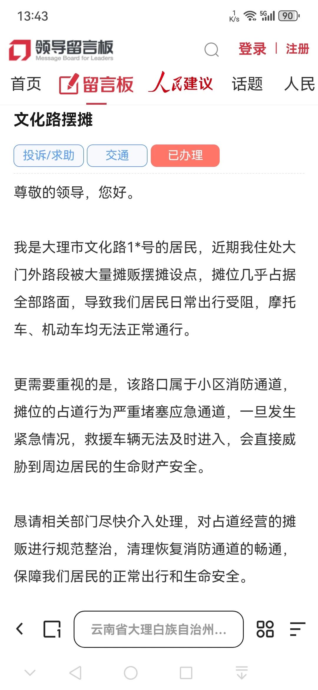 大理网民向大理州委书记留言反映“文化路小区门口路段摊贩摆摊设点影响居民正常出行”