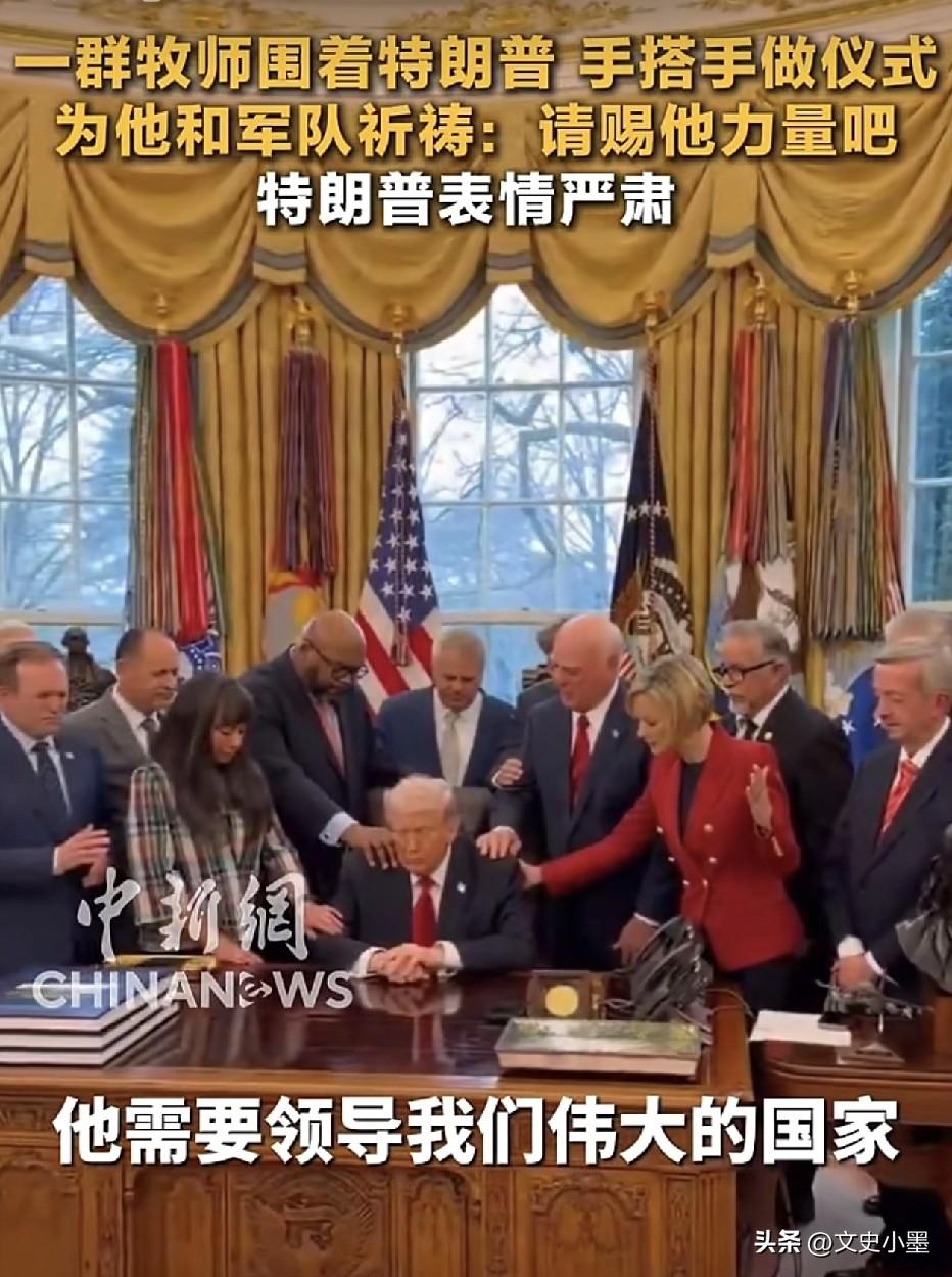 看来美国这次碰到硬骨头了,不得不祈求上帝帮忙了! 一群牧师在白宫把特朗普围了起来,一只手搭在他的肩膀上,仿佛在给他传递能量,同时口中念念有词,祈求上帝保佑他们的军队,给予总统力量继续领导国家! 特朗普坐在这群牧师中间,闭着眼睛表情严肃,仿佛在接受力量的传递! 这一幕看着挺讽刺的,这些牧师没有为无辜去世的人们祷告,反而在这里为始作俑者的人祈祷,让人捉摸不透在他们心里,到底信仰的是什么!