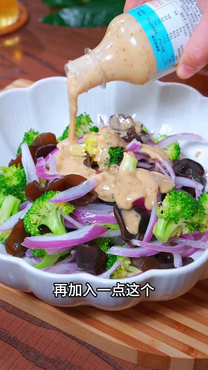 西兰花拌木耳。 你肯定想不到,西兰花、洋葱、木耳就这么简单拌一拌,竟然成了餐桌上非常抢手的美食。很多人都不知道,这道菜对女性朋友特别友好。西兰花被称作蔬菜之王,维生素和膳食纤维丰富,紫皮洋葱更是蔬菜皇后,花青素含量超高。 ·锅中水烧开,加一勺盐和少许食用油,放入切好的洋葱、西兰花和泡发好的木耳。这一步非常关键,加盐焯水不仅能减轻洋葱的辛辣味,还能让西兰花保持翠绿不发黄。 ·焯烫好后全部捞到碗里,再加入一点奇亚籽沙拉汁来提味,它里面有奇亚籽和白芝麻,口味非常好。用我漂亮的小手充分拌匀就可以开吃了。 是不是很简单?注重饮食的姐妹们赶紧收藏做起来尝尝。找不到奇亚籽沙拉汁在哪的家人,点我头像了解详情。
