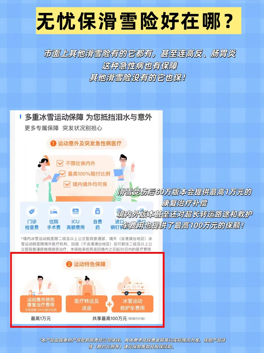 这个无忧保滑雪险,不仅保滑雪运动中常见的骨折、韧带拉伤,就连腹泻、普通感冒也保,医保报销完,自费200元免赔额后剩下的钱100%比例报销。并且!!!它还保滑雪雪具装备的损坏、丢失、被盗这些方面!