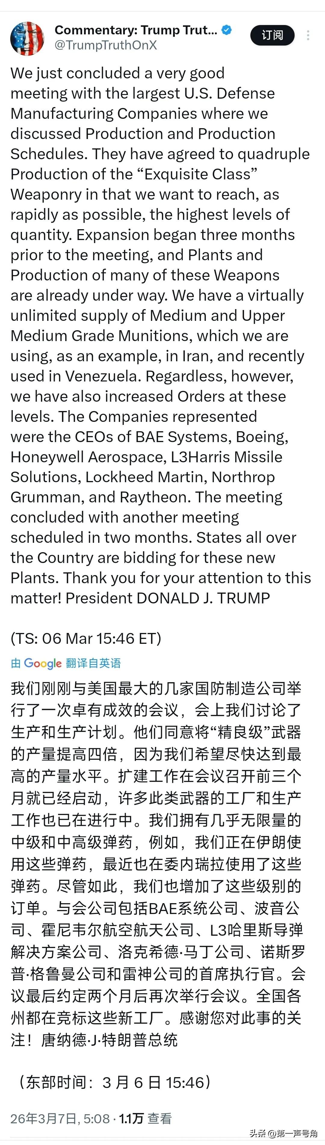 特朗普今天(北京时间3月7日)发文写道:“刚刚,我与美国最大的国防制造企业举行了一场非常成功的会谈,就武器生产及生产计划展开磋商。企业方已同意将‘精品级’武器的产量提升至四倍,我们要以最快速度实现该类武器的最高产能。相关扩产工作早在本次会谈三个月前便已启动,多款该类武器的生产厂房建设与量产工作均已推进。目前,我国拥有近乎无限量的中高端弹药储备,这类弹药正用于伊朗战场,近期也在委内瑞拉行动中投入使用。即便如此,我们仍在此量级上追加了订单。本次参会的企业均由首席执行官出席,包括英国宇航系统公司、波音、霍尼韦尔航空航天、L3哈里斯导弹系统公司、洛克希德·马丁、诺斯罗普·格鲁曼以及雷神公司。会谈最后,我们敲定两个月后再次会晤。全美各州正竞相争取这些新生产厂房的落地。” 评几句 看到特朗普这条推文,我仿佛穿越回了1958年——只不过这次喊"超英赶美"的是白宫主人本人。"精品级武器产量提升四倍",这口气比他的真实地产估值还虚。三个月前就开始扩产?那想必是1月6号国会山事件后,川总就顿悟了"枪杆子里出政权"的真谛? 更讽刺的是那句"近乎无限量的中高端弹药储备"——原来美国打伊朗、打委内瑞拉用的都是"中高端"弹药? 这定位精准得像是给导弹贴上了爱马仕标签。建议下次直接分级:打委内瑞拉的叫"轻奢款",打伊朗的叫"高定款",反正烧的都是纳税人的钱,不心疼。 七大军工巨头CEO集体站台,场面堪比好莱坞复仇者联盟集结。只是这阵容里英国宇航系统公司(BAE) 格外刺眼——说好的"美国优先"呢?原来"让美国再次伟大"的底气,还得靠英伦老铁来撑场子?特朗普的贸易保护主义在此刻选择性失明,毕竟双标是门艺术,盟友是块砖,哪里需要哪里搬。 【致命一问】 但且慢,川总——稀土材料跟得上吗? 您老人家怕是忘了,2023年中国稀土加工产能占全球87%,美国唯一稀土矿芒廷帕斯开采的精矿还得运到中国提炼。五角大楼去年刚承认,F-35战机每架要用417公斤稀土材料,"爱国者"导弹的制导系统离了钐钴磁体就是睁眼瞎。 现在您要四倍扩产?这相当于宣布要造四倍的汽车,却发现油箱里只有四分之一汽油。 更尴尬的是,您2025年对华加征的关税清单里,稀土永磁体赫然在列——自己给自己卡脖子,这操作比"注射消毒液治新冠"还魔幻。 建议两个月后的复会别光喊口号,先问问霍尼韦尔的工程师:没有中国出口的镝、铽、钆,您的"精品武器"是打算用乐高积木拼制导系统吗?全美各州争厂房的热闹背后,怕是整个国防工业都在焦虑地翻看稀土库存表。