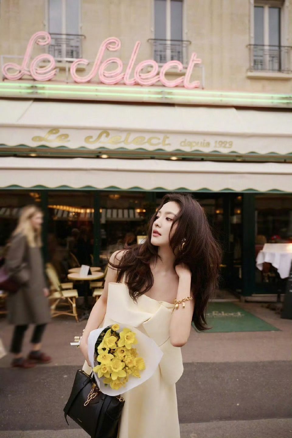淡黄长裙,超大蝴蝶结,章若楠往那儿一站,巴黎的春天就来了