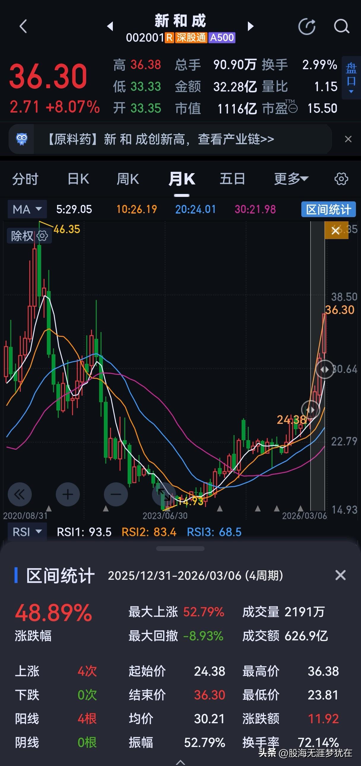 涨势如虹,维生素龙头还有多少涨幅空间? 最近,化工板块迎来了一波较大上涨。作为国内最大的维生素龙头,新某成也收获了极大的上涨空间。 让我们看看其月线,2026年1月,股价从最低点24.96元来到27.86元,上涨了10.6%;2月份,从最低点26元来到31.5元,上涨了13.07%;而三月,只是5个交易日,股价从最低点31.44元来到昨天收盘价36.3元,收获了15.26%的上涨。 仅仅两个月多,新某成大幅上涨了48.89%。熟悉我的粉丝们都知道我从去年3月17日就半仓持有,中间未做过任何加减仓。于是最近很多粉丝问我,本波行情什么时候见顶?目标价会来到多少?要回答这个问题之前需要明白它的上涨逻辑是什么? 新某成的上涨逻辑是什么?有的人会说化工的周期到了,但这不是其主因。本轮化工板块热点集中在农药、化肥、煤化工、新材料等等,但新某成的主营业务维生素和这些都不沾边。其实,它的上涨逻辑就是周期反转加上低估值修复。 面对数年持续高增长的财务表现,新某成在2021年创下46元的高点后,股价持续回落。到了去年,股价在20元附近震荡,而估值(PE)只有10,接近了银行的估值。在大盘不断创新高的情况下,终于有主力资金发现了这块“璞玉”,于是就迎来了最近持续的高光表现。 所以,新某成的上涨就是因为周期拐点加估值修复的“戴维斯双击”。明白了这一点,那么就大概可以预测本轮它的阶段性高点。 截止昨天收盘,新某成的PE来到了15,按照化工股的平均估值20,还有5个值的空间,对应的股价还有10元的上行空间。也就是说,如果按照估值修复,新某成的高点会在46元左右。 当然,估值是个动态,尤其是财报的变化。4月16日,会出2025年年报。前三季度的财报已经足够优秀,如果四季度还会超预期,那么一份靓丽的年报公布后,估值还会下降。如果这样投资者还会继续持有并推高股价,历史最高价60元,也许会突破。 总结一句:周期反转加估值修复带来的“戴维斯双击”会带给新某成本轮46元左右的股价上涨空间;而去年财报的表现,决定了下一阶段能不能突破历史60元的最高价。 最后声明:以上内容仅代表个人观点,不构成任何投资建议。股市有风险,投资需谨慎! 化工周期股 化工补涨 股市分析