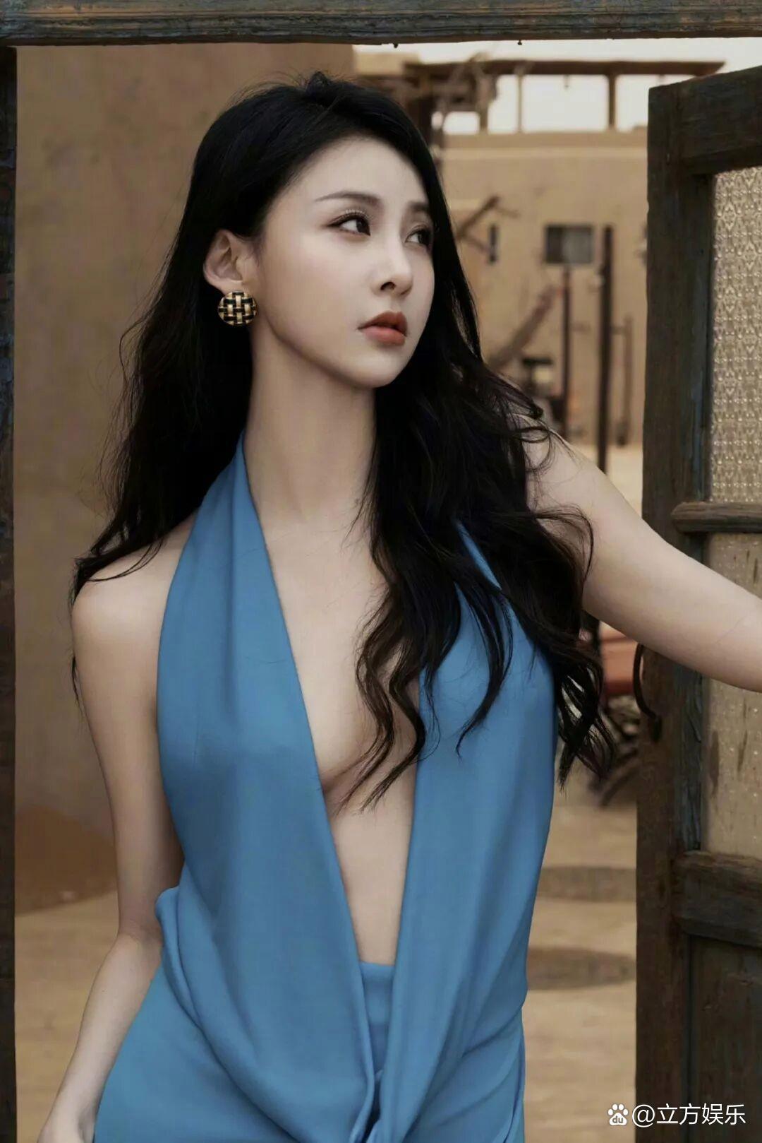 贾青沙漠深V蓝纱裙写真