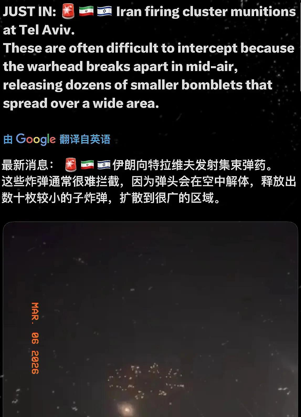 据新华社报道,伊朗在对美以的反击行动中,使用了一吨重弹头的“霍拉姆沙赫尔-4”超重型导弹,精准打击了以色列特拉维夫市中心、本-古里安机场以及位于该机场的以色列空军基地。从以色列当地传出的现场视频来看,可以清晰看到导弹的弹头在接近目标上空时,突然释放出大约22个子弹头。这些子弹药,以高速散射的形式下落,形成了一个覆盖数平方公里的密集打击区。这种无差别覆盖式攻击模式,类似于“天女散花”,能够同时摧毁多个分散的目标点。更令人惊叹的是,这款携带着集束弹头的导弹,竟然成功突破了以色列引以为傲的七层防空系统。这7层防御从太空到地面分别是:在大气层外拦截远程导弹,甚至可以反卫星的箭3;在高空中拦截中程导弹的箭2;由美军部署的在中高空拦截中程导弹的萨德防导系统;在中高空拦截中远程导弹和火箭弹的大卫投石索;在中低空拦截飞机无人机和战术导弹的爱国者反导系统;在低空拦截无人机火箭弹和迫击炮弹的铁穹防御系统;近距离拦截无人机导弹火箭弹的铁束激光防御系统。以方曾宣称该体系拦截率可达90%以上,甚至夸口“连一枚火箭弹都飞不进去”。但这次伊朗的“霍拉姆沙赫尔-4”导弹,如同一把利刃,轻松撕开了这道看似密不透风的防线。“霍拉姆沙赫尔-4”导弹,是伊朗本土研发的“杀手锏”武器,代表了伊朗军工目前最高的导弹技术水平。最大射程约2000公里,这意味着从伊朗西部或中部地区发射,即可轻松覆盖以色列全境。导弹全重约30吨,长13米,直径1.5米,虽然基于液体燃料推进,但伊朗改进了燃料储存技术,使其具备快速发射能力。采用公路机动发射车部署,避免了固定发射井易被首轮打击摧毁的弱点,生存能力极强。在飞行过程中,导弹在大气层外可达16马赫(约每小时2万公里),再入大气层后维持8马赫,飞行时间仅10-12分钟。这种极短的反应窗口,大大压缩了以色列防空系统的预警和拦截时间。即使是最先进的雷达,也难以在如此短暂的时段内,完成锁定、计算和发射拦截弹的全过程。再加上集束释放机制,也就是导弹在接近目标时,主弹头会分离并释放多个子弹药,这些子弹药呈散射轨迹下落,进一步饱和了防御系统。即使主弹头被击中,子弹药仍可能继续下落。很多人对集束弹药的认知还停留在“大范围杀伤”,但伊朗此次的应用却将其优势发挥到了极致。这种武器虽然在国际法上备受争议,但在军事语境中,它代表了低成本、高效的反制手段。无需瞄准单个目标,只要在目标上空完成释放,就能对露天停放的战机、机场跑道、后勤设施进行毁灭性打击。这种“天女散花”般的打击模式,对以色列空军基地而言无异于“天敌”。即便子弹药的爆炸力不足以击穿加固的地下掩体或指挥中心,它们也能通过碎片和冲击波摧毁基地的辅助设施,如通信天线、电力供应和维修车间,从而令整个基地陷入瘫痪状态,无法快速恢复作战能力。从武器发展的宏观视角来看,伊朗此次行动堪称“非对称作战”的教科书式演示。美以的防空体系虽然技术先进,但成本高昂。拦截一枚弹道导弹,往往需要发射数枚甚至十数枚昂贵的拦截弹。而伊朗通过改进液体燃料技术和本土化生产,研制出“霍拉姆沙赫尔-4”这类超重型导弹,并搭配集束弹头,既保证了远程投送能力,又极大提升了毁伤效率和性价比。对于以色列这样国土面积狭小、战略纵深有限、军事目标高度集中的国家来说,一吨重的集束弹头带来的不仅是物理上的破坏,更是心理上的震慑。空军基地的瘫痪可能导致空中优势的暂时丧失,进而影响整个战局的走向。特拉维夫市中心和本-古里安机场作为经济和交通枢纽的打击,更是放大这种效应,迫使以色列重新评估其防御策略。可以说,伊朗此次的“集束弹头破防”,让以色列的防空神话走下神坛。