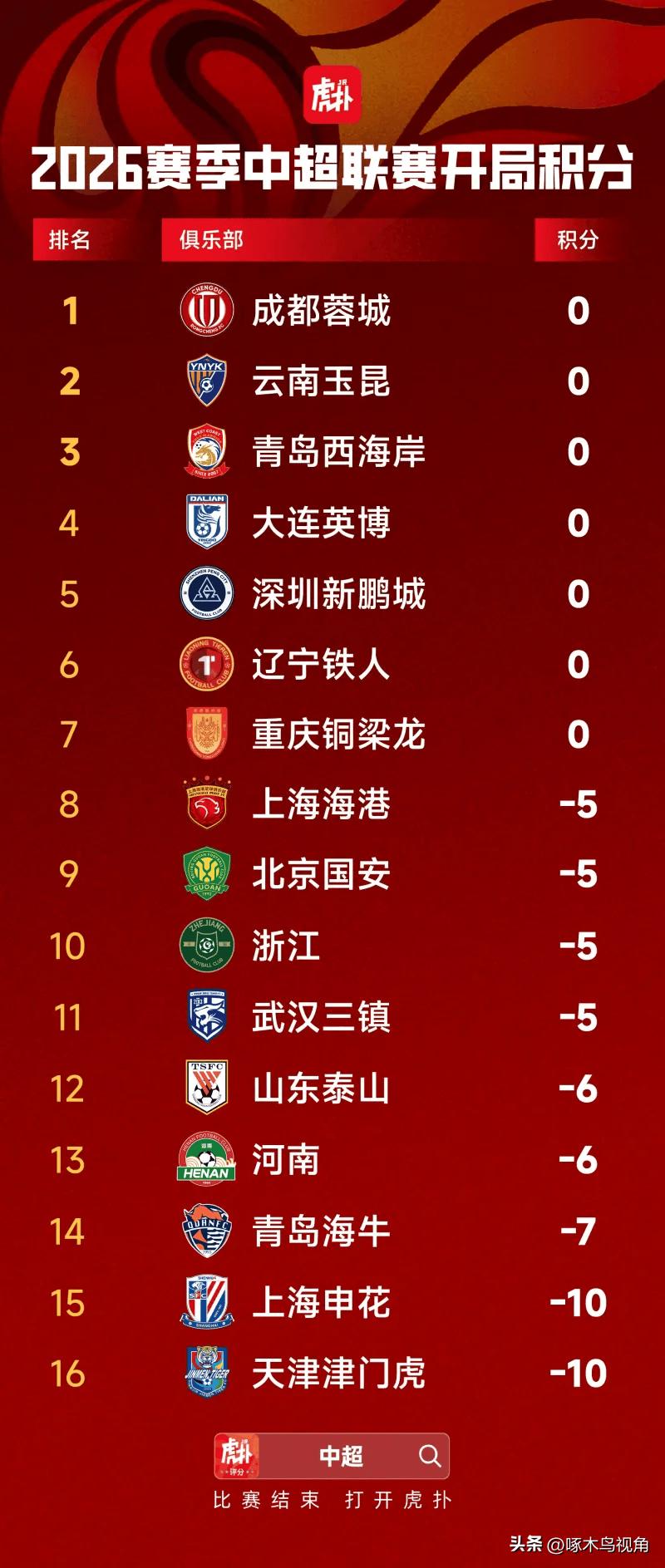 揭幕战5—1大胜,蓉城嗅到了火神杯的气息。 3月6日,中国足球超级联赛战火重燃。在凤凰山专业足球场四万多名观众见证下,成都蓉城5—1大胜深圳鑫鹏程。可谓是酣畅淋漓,为本赛季开了个好头。 感谢中国足协的厚爱,把揭幕战设在了凤凰山足球场。这也预示着新赛季,蓉城将占有天时地利人和。中超四年了,我们喊了四年“雄起”。这四年我们听惯了“保花”,“保港”,见鬼去吧!2026我蓉掀桌子来了! 整治“假赌黑”效果正是显著,9支球队背负负分出战,联赛格局迎来历史性重塑。前七球队唯我蓉独善其身。 上海海港—5,北京国安—5,浙江—5,武汉三镇—5, 山东泰山—6,河南—6, 天津—7,上海申花—10, 天津津门虎—10。 坑里还真有些拥挤,你们慢慢往上爬吧。我蓉先走一步了!