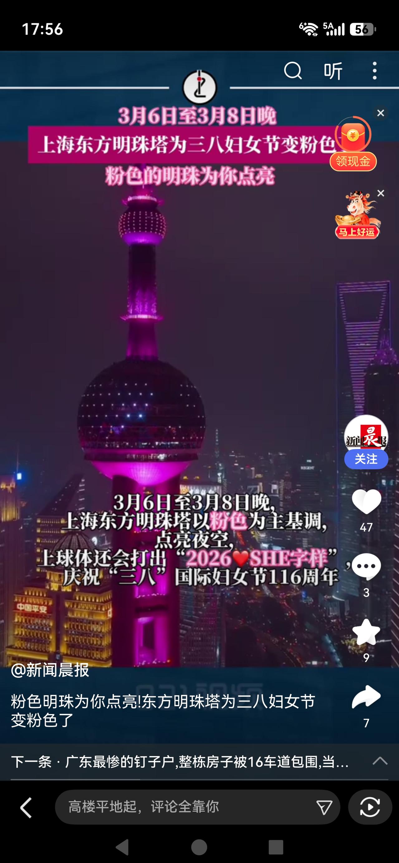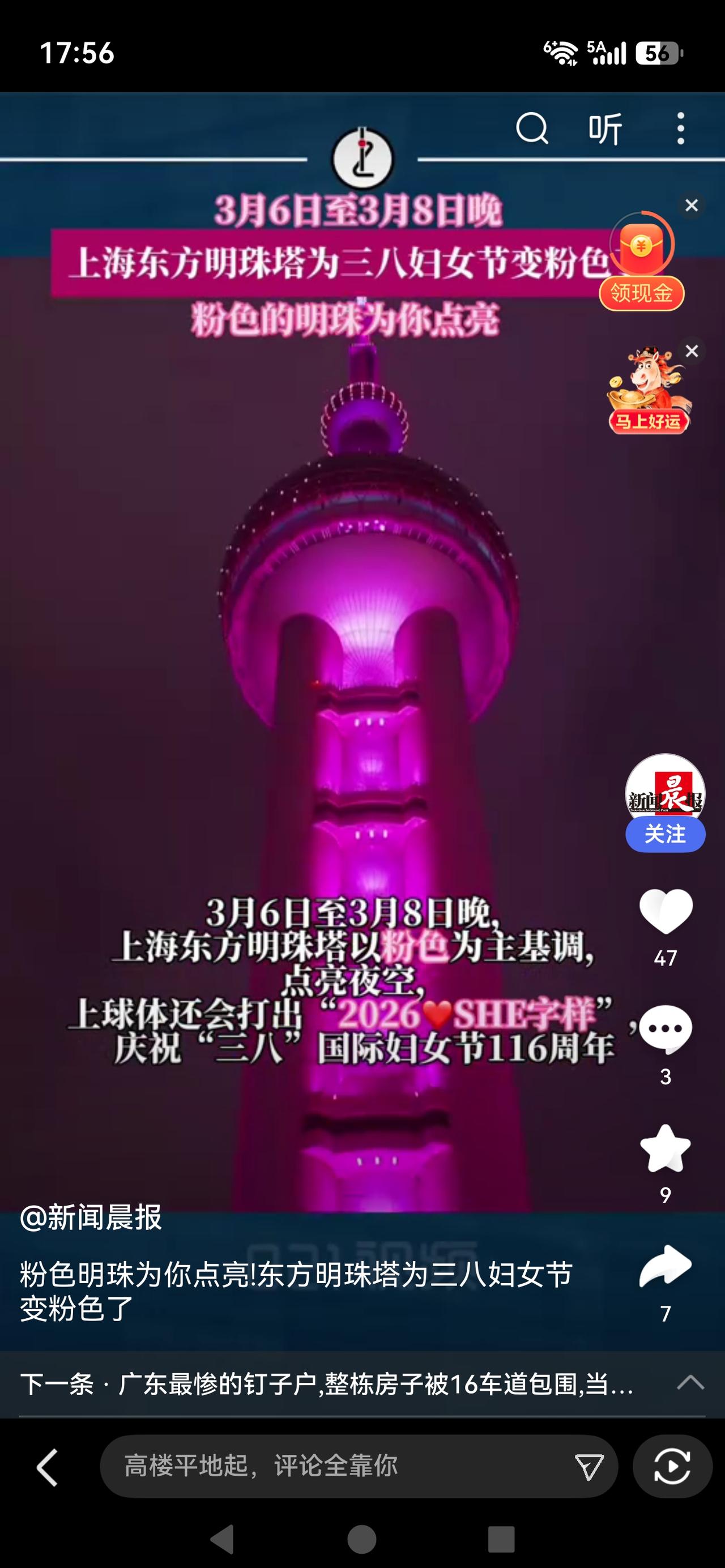 《东方明珠塔为她们“披上”粉色!妇女节这天,整座城市都在说“你很美”》 一夜之间,上海东方明珠换上温柔粉色新装,黄浦江畔被浪漫包围,瞬间刷屏全网。这抹粉,不只是灯光变色,更是一座城市对女性最直白的敬意。 粉色不再是柔弱的标签,而是温柔又有力量的象征。从职场精英到家庭主妇,从白衣天使到基层劳动者,无数女性在各自岗位发光发热,撑起半边天。东方明珠以地标之姿点亮粉色,是看见、是尊重、是祝福,告诉每一位女性:你的付出,值得被全城瞩目;你的光芒,值得被世界看见。 这背后,是社会对女性价值的愈发认可。不再只强调外貌与年龄,更致敬独立、坚韧、担当。女性可以温柔,也可以强大;可以精致,也可以果敢。一座城市为女性亮灯,点亮的是底气,是包容,是对“她力量”的最高礼赞。 太暖了!这抹粉色,比任何礼物都动人。女性从不是谁的附属,而是自己人生的主角。 愿每一位女性,都被温柔以待,也能勇敢做自己。不被定义,不必迎合,自在绽放,活成自己最喜欢的模样。三八节将至,致敬每一个了不起的她,也愿我们都能在这粉色光芒里,看见更强大、更美好的自己。为这波暖心操作点赞!热点话题 东方明珠披上“粉衣”