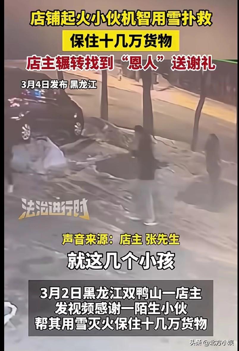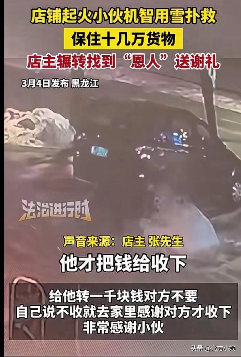 黑龙江的几个小伙,路过街边店铺时发现了店铺起火了,由于附近也没有水,怎么救火啊?但是这并没有难住他们,他们看到了路边一个大雪堆,因此机智地用雪救火,他们有的用手抓雪、有的用桶铲雪,他们迅速地在雪堆和店铺之间来回奔跑帮忙灭火,最终灭了火,保住了店铺里十几万的货物,把店主的损失降到最小,一共只有4条轮胎被烧,只损失了1000多元。 店主得知后,寻人想要表示感谢,联系上了这几位小伙,给转1000元感谢,然而对方坚决不收,店主表示如果不收,就送去家里,最终对方收下了。 我看到这个新闻很感动,这几位小伙虽然年纪不大,还是贪玩的年纪,但是看到店铺起火却很热心地帮忙救火,而且还很聪明,就地取材用雪救火,他们在做了好事后却是默默地走了,店主联系上了,也是再三婉拒感谢。 这几位小伙太优秀了,他们挽救的损失可是几十万不止,甚至是上千万,因为这是商铺,一着火可能连累了整栋楼。黑龙江的人太热心了,点赞!