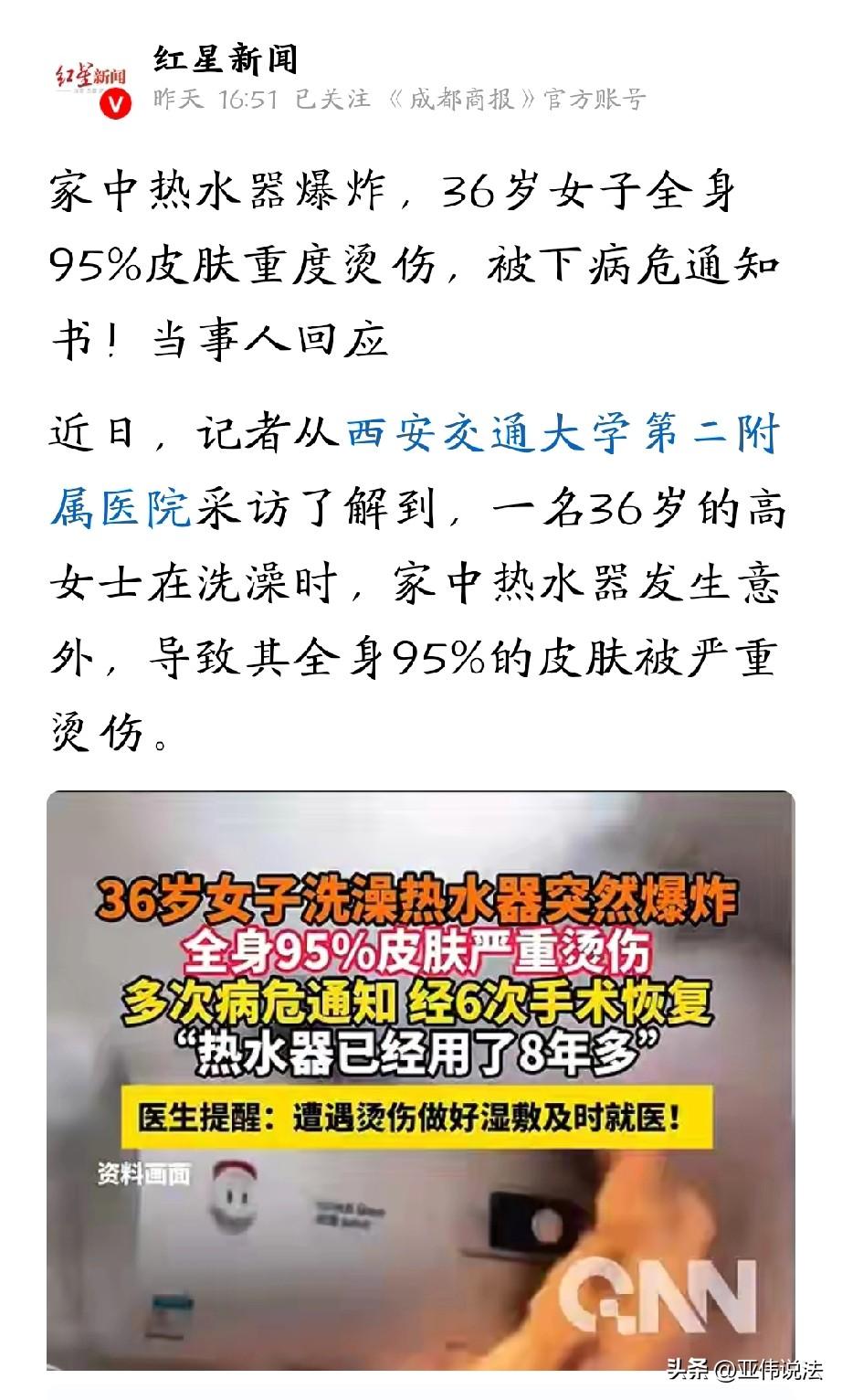 陕西西安,36岁女子洗澡时,突然头顶传来一声巨响,热水器炸了,滚烫的开水喷涌而出,劈头盖脸浇在她身上,女子发出惨痛的哀嚎。经医生诊断,她全身95%皮肤严重烫伤,身上几乎没有一块好地方,情况危急,医院接连下了好几次病危通知。经过调查,这起悲剧发生的原因,让人后背发凉。 36岁的高女士,怎么也没想到,一次再普通不过的洗澡,会彻底改变她的人生。 那天,高女士像往常一样走进卫生间,准备洗个澡放松一下。 她打开热水器,调好水温,热水刚淋到身上没一会儿,突然,头顶传来“砰”的一声巨响,热水器炸了! 还没等她反应过来,滚烫的开水就从破裂的水管里喷涌而出,劈头盖脸地浇在她身上。 卫生间的狭小空间让她无处可躲,瞬间,惨叫声被爆炸声淹没。 高女士拼尽全力拉开门逃出来时,全身皮肤已经红白一片,大片大片的表皮脱落。家人吓坏了,赶紧把她送到西安交通大学第二附属医院。 医生的诊断让人倒吸一口凉气:全身95%皮肤重度烫伤,这几乎是全身没有一块好地方。因为伤势太重,医院接连下了好几次病危通知书。 事后调查发现,罪魁祸首是热水器里的感应器失效了。 这个热水器用得年头太长,加上长期不断电,感应器失灵后,水温一路飙升到100℃,热水烧开产生大量蒸汽,最终引发了爆炸。 对高女士来说,噩梦才刚刚开始。 在ICU里,她一次次与死神赛跑。医生们轮流上阵,为她做了无数次手术,才把感染的关口闯过去,慢慢把全身的创面封上。 命虽然保住了,但接下来的日子,每一秒都是煎熬。 换药时撕心裂肺的疼,镜子里面目全非的自己,还有以后漫长的康复路,皮肤萎缩、关节僵硬、无法正常活动。 往后余生,她都要活在这次意外留下的阴影里。 如今高女士已经出院,能自己吃饭,慢慢走动。 但没人知道,夜深人静时,她想起那天走进卫生间的那一刻,心里有多后悔、多痛苦。 高女士的遭遇,心里堵得慌,谁能想到,简单的一次洗澡,会遭遇如此无妄之灾。 现在高女士保住了命,但往后几十年的日子,她要面对的是镜子里的自己,是一辈子脱不掉的伤疤,全家人跟着她一起熬。 这个家,被一个本该可以避免的事故,彻底砸碎了。 回过头想想,罪魁祸首就是,热水器用了太多年,而且长期通电,感应失效。 这东西家家户户都有,平时谁也不拿它当回事,只要还能打着火,还能出热水,就觉得它“还能用”。 什么年限到了该换,什么插头用完要拔,什么找人检修,都知道,但都没往心里去,总觉得出事的是别人,轮不到自己家。 高女士的遭遇就是一记耳光,狠狠扇在所有人心上,千万不要报侥幸心理,要命。 家里的热水器,不管是燃气的还是电的,用的年代久了,必须得换,别舍不得。 平时用的时候,该断电断电,该拔插头拔插头,别图省事一直开着,该找人检修的时候,别嫌麻烦,花几十块钱买一份安心,不亏。 《民法典》第1203条规定:因产品存在缺陷造成他人损害的,被侵权人可以向产品的生产者请求赔偿,也可以向产品的销售者请求赔偿。 在高女士的悲剧里,热水器因感应器失效、超期使用、长期通电导致爆炸并致人重伤,属于产品缺陷与使用维护不当共同引发的侵权事件。 依据上述法条,若经鉴定热水器存在质量、设计或警示缺陷,生产者与销售者需承担无过错赔偿责任。 高女士可直接向任一主体主张医疗费、残疾赔偿金、精神损害抚慰金等全部损失,责任方赔偿后可按过错比例内部追偿。 但高女士一家长期不检修、超期服役、持续通电未尽到安全注意义务,自身存在一定过错。 高女士用自己的后半辈子,给我们上了一课,千万别等灾难发生了,才知道后悔。