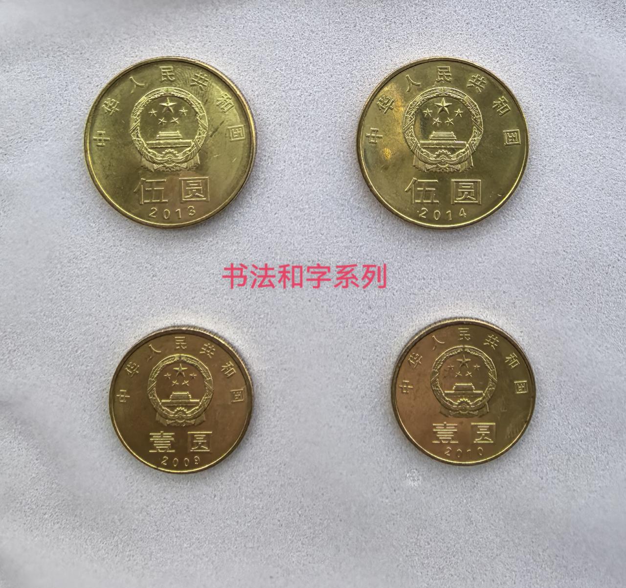 “和”字流通纪念币于2009年至2017年间分五组发行的书法主题普通纪念币,目的是系统展现中华汉字中的“和”字,其古代书法艺术传承。 本人上网查询一下:此系列纪念币分别以篆、隶、行、草、楷五种书法体“和”字,完整呈现书法字体演变脉络,全套共计五枚。 该系列币正面:国徽及国名,背面:书法“和”字。 本人只收集到四枚,目前还缺一枚“和”字币,不知目前市场价是多少,准备上某宝上淘淘,是否能够凑齐“和”字一整套。 请懂行的友友们指点一下![祈祷][祈祷]