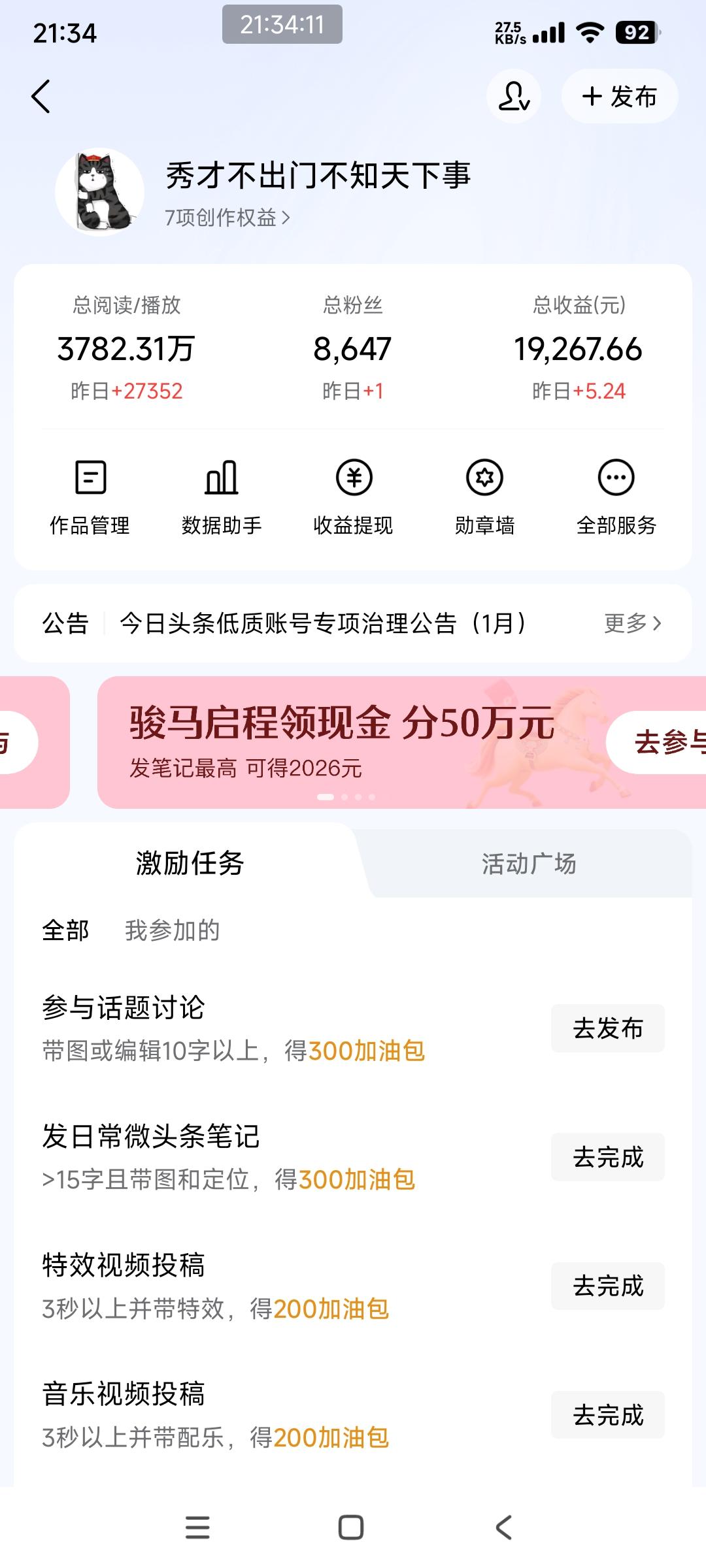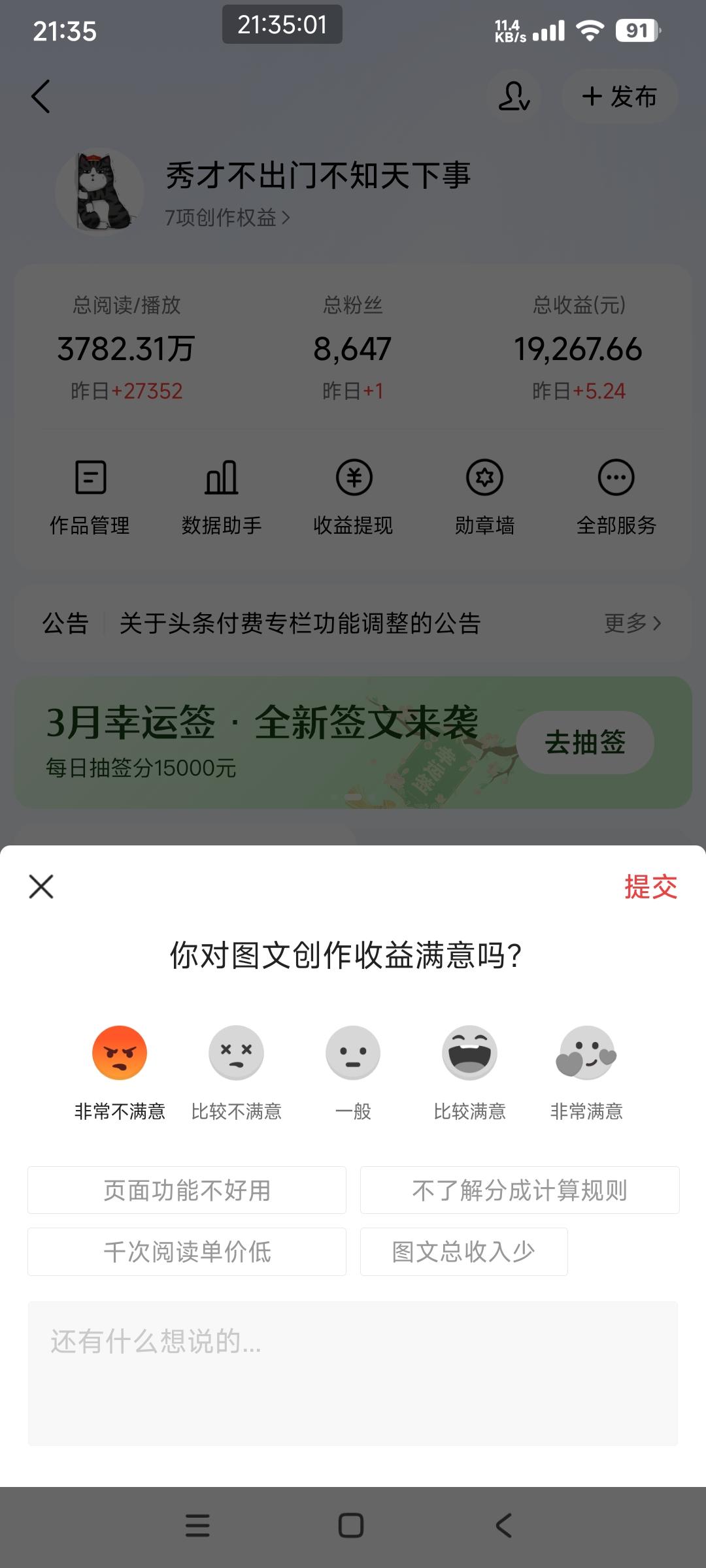 头条上一个功能 点击总收益界面,退出的时候会有一个调查问卷。 问你对图文收入满意吗? 我每次都会点非常不满意。 因为今年头条的图文收益真的非常少。 大家有空也可以参与调查,给头条反馈一下。 希望头条看到我们这些作者辛苦码字,收益却连一杯奶茶都买不到,提高一下作者的收入。