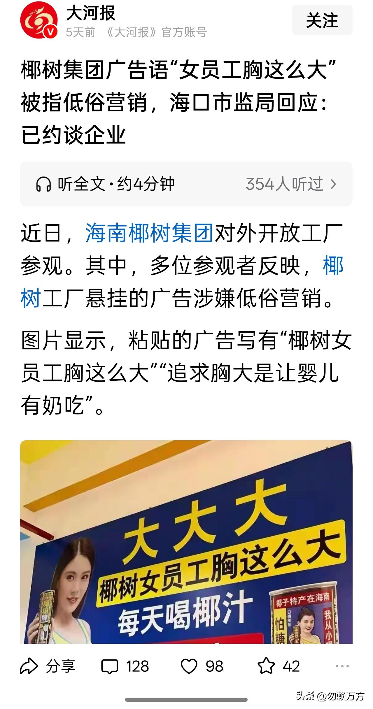 椰树工厂开放日,有多位参观者反映其厂区的广告低俗。厂区的广告外人不容易看到,但他们的员工每天都会看到,他们不会觉得尴尬么?应该会的。但是一方面,久入鲍鱼之肆,不觉其臭;更主要的是工厂是他们的衣食来源,反感也只能忍着,大家都有自己的无奈之处。 但是椰树这家的低俗广告也是无奈么?早年“从小喝到大”的广告语也有些暧昧,但至少还有些机巧,如今的广告算是聪明劲儿也不要了,就是赤裸裸的恶俗。当一个人靠机巧不断地捡到兔子,就会形成路径依赖,不再愿意费劲去辛苦劳作,这算不算是他们的无奈呢?[笑哭]椰树海报