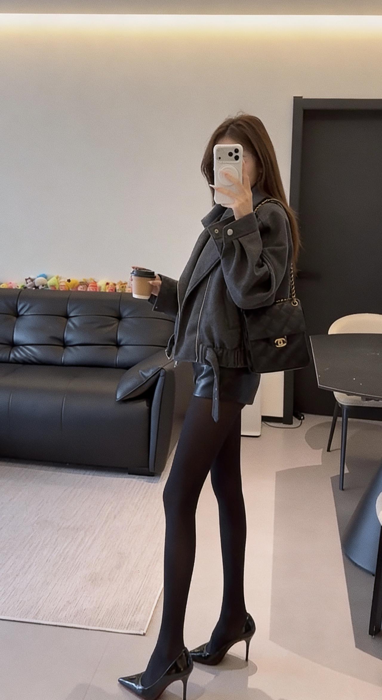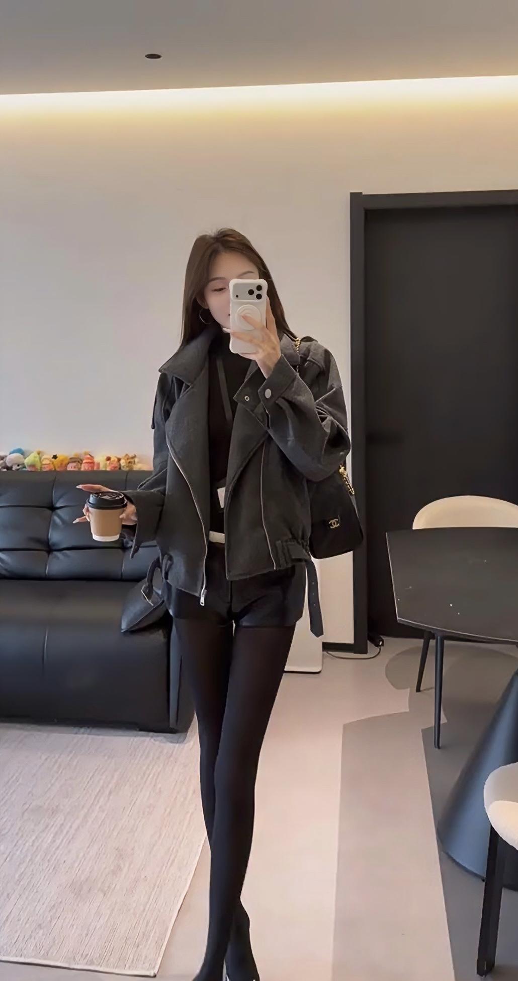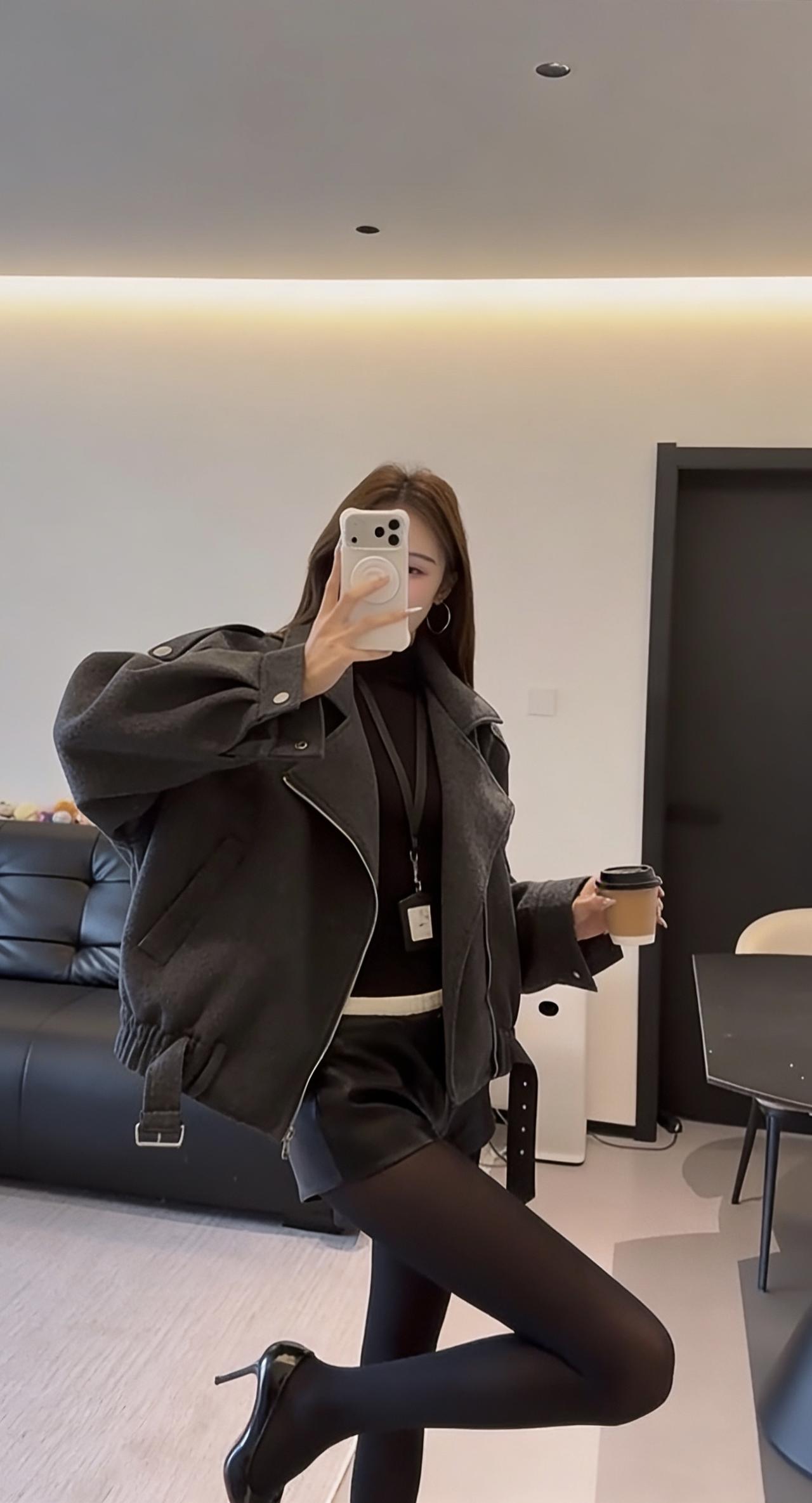 正常穿搭推荐,无不良引导。这套穿搭主打秋冬的反差感风格,核心是用硬朗质感的外套中和下半身的柔媚细节,打造出清冷又带点小性感的氛围。 • 核心单品:深灰色短款毛呢机车夹克,宽松落肩版型藏肉显瘦,翻领+金属拉链的机车元素自带酷飒气场,短款剪裁优化比例,显腿长;内搭黑色修身打底,简约不抢镜,突出外套质感。 • 下装搭配:黑色皮质短裤+黑色打底裤,皮质短裤提升精致度,黑色打底裤若隐若现的透肤感修饰腿型,同时增添女人味,避免全黑造型的沉闷感。 • 鞋履配饰:黑色尖头细跟鞋,拉长腿部线条,强化整体利落感;搭配黑色皮质单肩包,与鞋履、下装形成材质呼应,整体色调统一,高级感拉满。 这套穿搭风格灵活,适配多种场景,兼顾时髦度与实用性: 1. 日常出街/探店:简约又有记忆点,走在街头或逛网红咖啡店、艺术展馆时,回头率高,拍照出片率也高。 2. 轻社交场合:闺蜜聚会、下午茶等轻松场景,既不会过于随意,又能展现穿搭品味。 3. 通勤休闲(非严肃职场):适合创意类、休闲风职场的日常通勤,用简约的灰黑配色展现干练气质,又不会像正装那样拘谨。