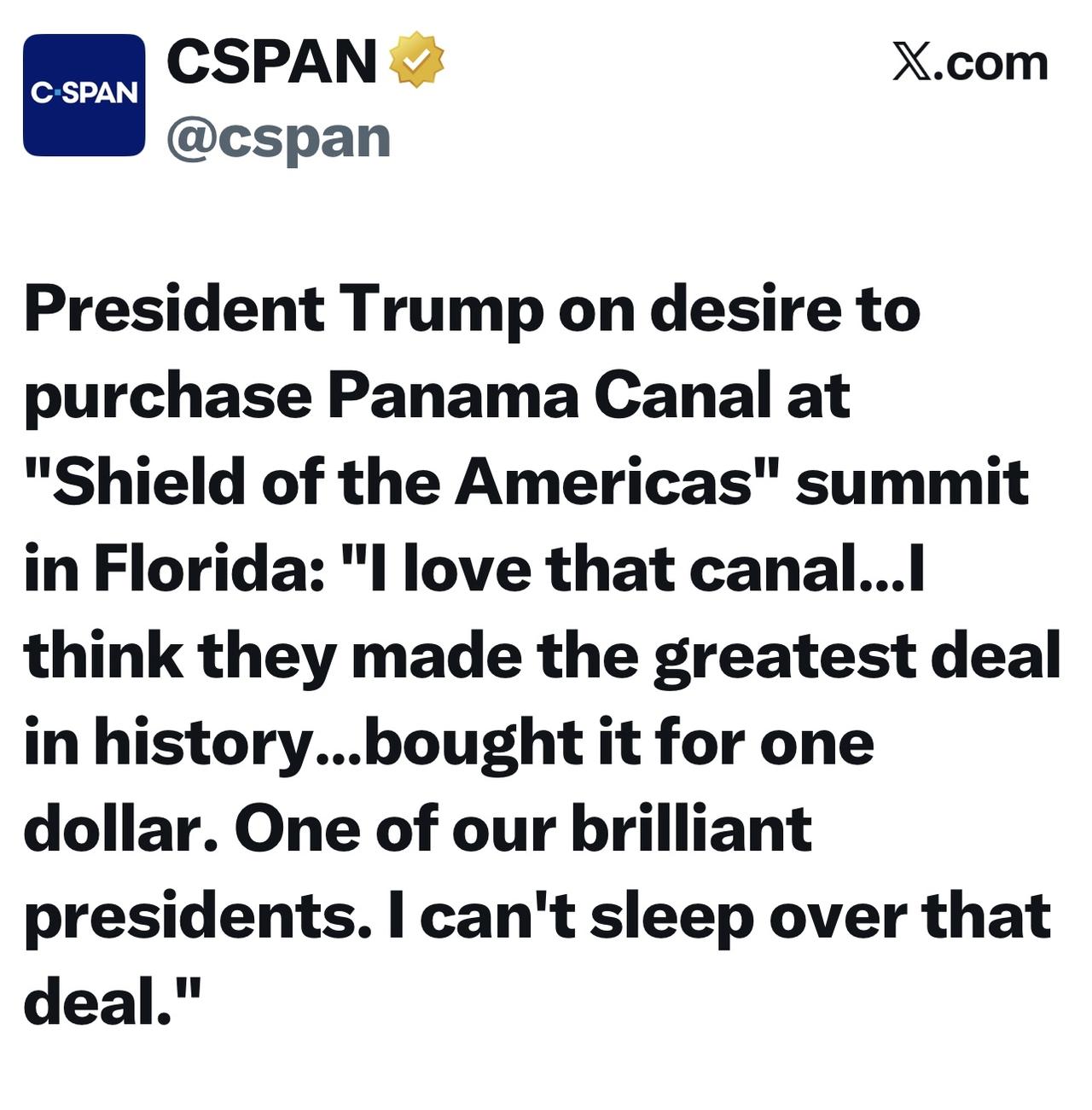 特朗普在佛罗里达州举行的“美洲之盾”峰会上谈到购买巴拿马运河的意愿时说:“我喜欢那条运河……我认为他们达成了历史上最伟大的交易……只花了一美元就买下了它。我们一位杰出的总统。我为此兴奋不已。”
