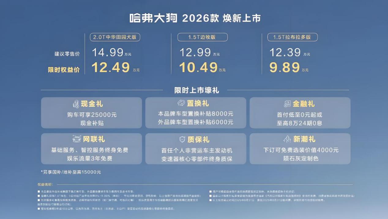 作为哈弗品牌旗下主打“3/4刻度”轻越野的紧凑型SUV,2026款哈弗大狗凭借亲民的售价、稳定的市场表现、硬朗的外观设计、焕然一新的内饰以及强劲的动力配置,再次引发市场轰动。官方指导价为12.39万-14.99万元,共推出3款车型。限时权益价进一步下探至9.89万-12.49万元。这种定价策略堪称“诚意满满”,直接将入门价格拉低至10万元以内,对比同级竞品,如比亚迪宋PLUS(售价12.98万起)、长安CS75PLUS(售价11.79万起),哈弗大狗在价格上的优势也更加明显。此外,大狗还推出了一系列购车礼遇,包括置换补贴、0首付或至高8万24期0息金融礼等,进一步降低了购车门槛。这种“加量不加价”的策略,不仅迎合了预算敏感型消费者的需求,也让2026款哈弗大狗在综合性价比上的更为突出。