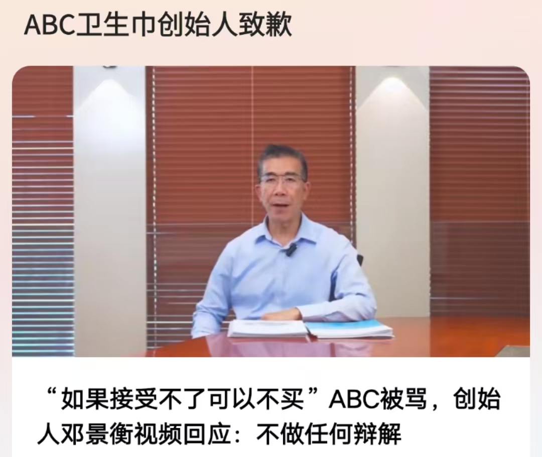 11月22日,ABC创始人在自己的社交账号发布了一则视频,回应近期ABC发生的事件。他表示:“最近ABC因为国标负差和经销商客服的不当言论,收到许多投诉,在这里不做任何的辩解,再次郑重向大家道歉。”