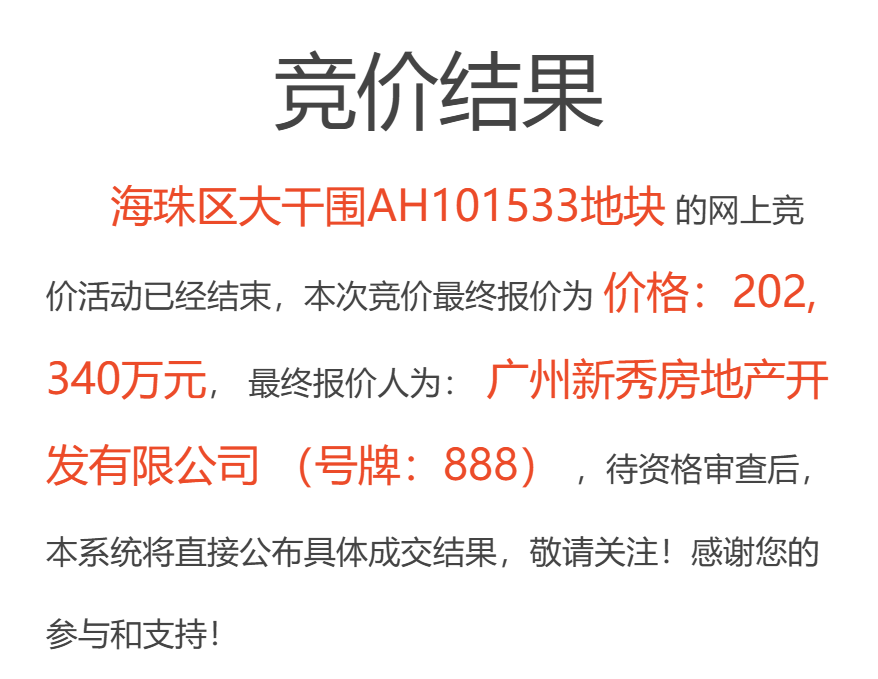广州新秀房地产开发有限公司以底价20.234亿元斩获海珠区大干围AH101533地块,折合楼面价33501元/㎡。