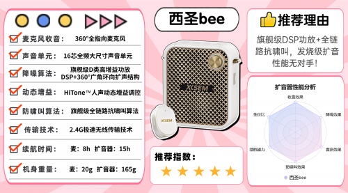 安利品牌1:西圣bee领夹扩音器推荐指数:★★★★★推荐语:扩音器里的硬核王者,性能天花板级存在!
