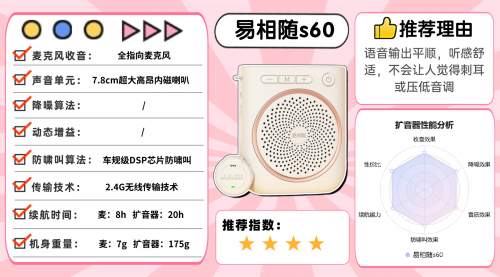 扩音器哪个牌子性价比高?易相随S60无线/有线双模式扩音器功能全面,7g麦克风、175g扩音器轻量化设计,全指向麦全方位拾音,7.8cm内磁大喇叭扩音有穿透力。车规级DSP芯片防啸叫,2.4G无线40米传输稳,续航麦克风8h、扩音器20h耐用,Type-C充电方便,3.5mmTRS接口适配广,支持U盘播放与小音箱功能,适配多场景,综合实用价值高。文末总结