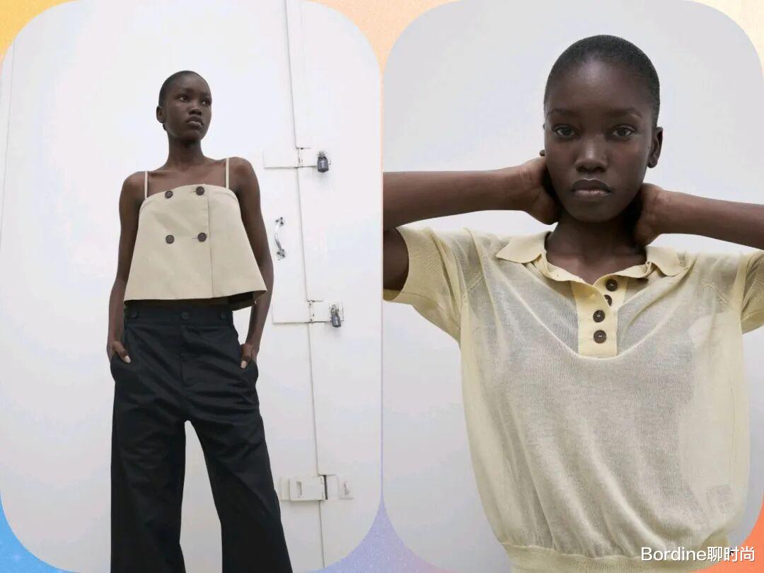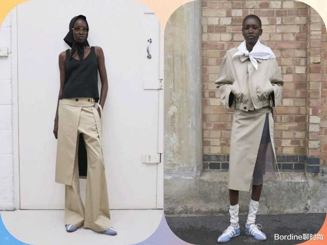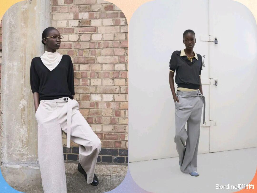浅色系的浅卡其色的颜色在低调的素雅气质中,纯色的简约也在围裹设计的开叉裙、背心、夹克等款式之间的搭配,为这些低调的服装也增加了一些撞色冲击的时尚感。