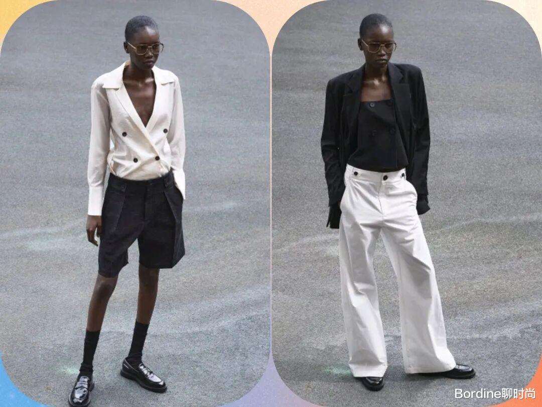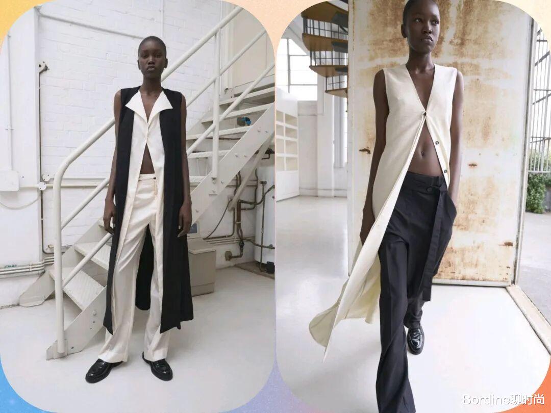 经典黑白色彩的对比在服装之上结合了一些无袖的马甲款式,带着不少休闲的利落感,还在宽松的廓形上也增加了直线线条的舒适感,而在和直筒裤的搭配也更为利落一些。