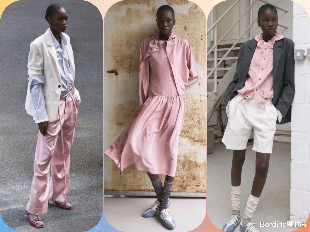 服装以粉色颜色增加了一些色彩的粉嫩柔和,在纯色的颜色中多了一些少女感的娇俏感,在直筒裤的利落、改良设计的时髦、套装裙的休闲优雅等气质中,展现了更多的粉色气质感。