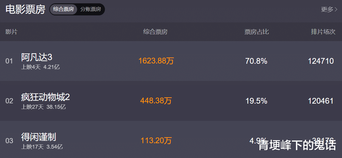 更令人费解的,是它在影院中遭遇的“冷待”。在许多影院,上映近一个月的《疯狂动物城2》仍占据着黄金场次,其排片占比甚至在近日与《阿凡达3》几乎持平。然而,若对比二者的票房转化效率,数据揭示了一个残酷事实:同样的排片条件下,《阿凡达3》的票房占比高达70.8%,而《动物城2》仅为19.5%。