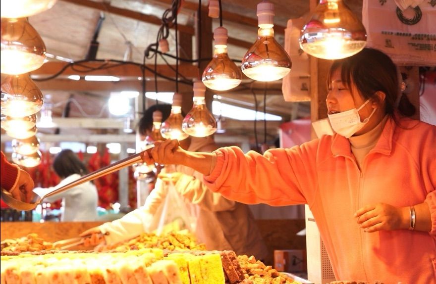 市集上,全新的摊位装置洋溢着喜庆氛围。各色摊位依次排开,满目皆是新年好礼:传统小吃零食、寓意吉祥的春联福字、丰富多样的糖果饮品等年货商品应有尽有,还能淘到各色东南亚小零食,满足了市民一站式购齐年货的需求。尤为贴心的是,部分食品类商品还提供“先品尝后购买”的服务,让顾客在选购时更能称心如意。无论是置办家庭年货,还是挑选走亲访友的手信,这里都能让人满载而归。