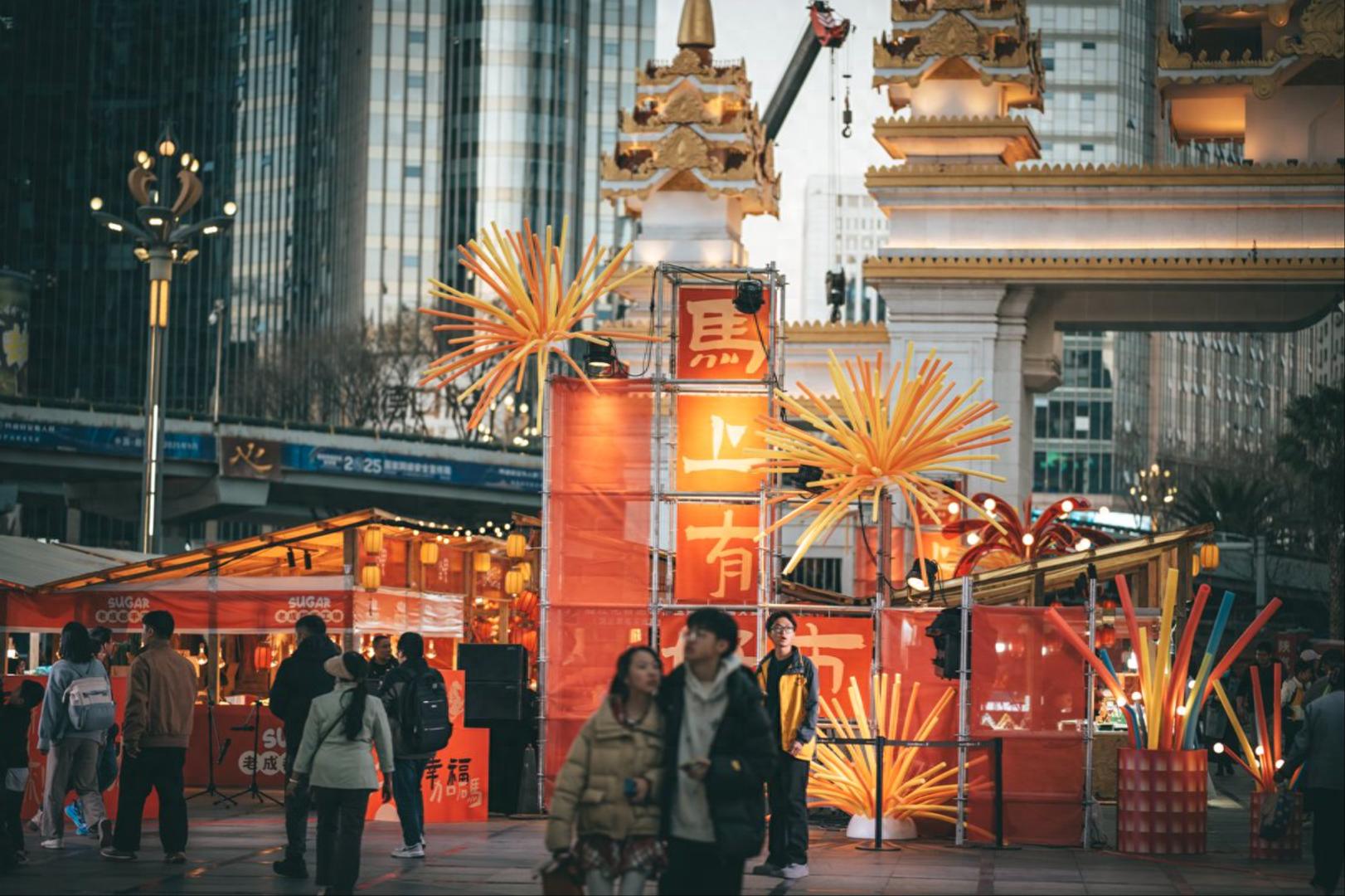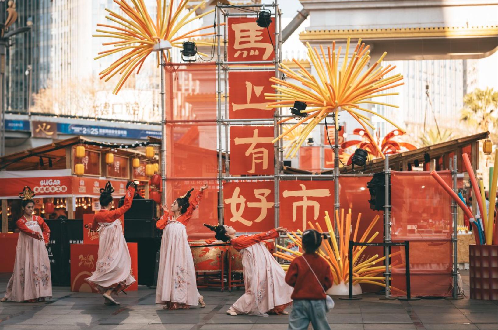 除了丰富的物质采买,市集更准备了丰盛的文化大餐。每逢周末,广场市集区便成为欢乐的舞台。下午时分,三场主题舞蹈轮番上演:15:00的“马到成功”马年主题舞活力开场;16:00的“新春锦画”非遗主题舞展现传统技艺之美;17:00的“策马旗风”马年主题舞再掀热潮。入夜后,悠扬的民乐声响起,19:00-19:30及20:00-20:30两个时段,专业民乐队的现场演绎,为夜晚的市集增添了典雅与温情,让市民在购物之余,也能享受一场场精彩的视听盛宴,感受浓郁的传统年节文化氛围。